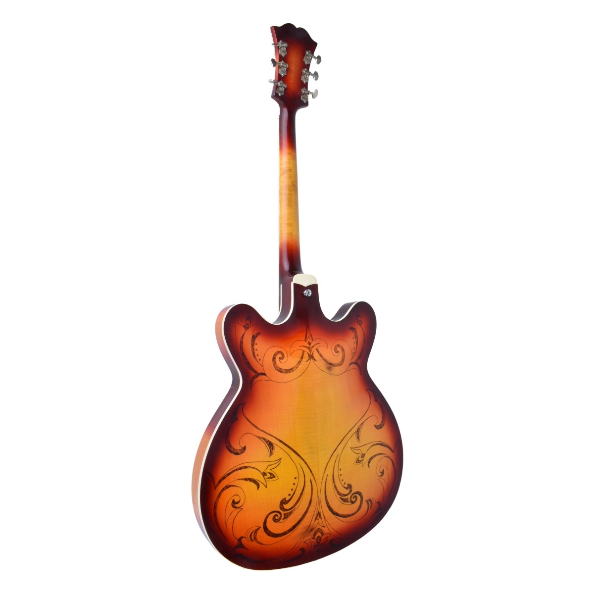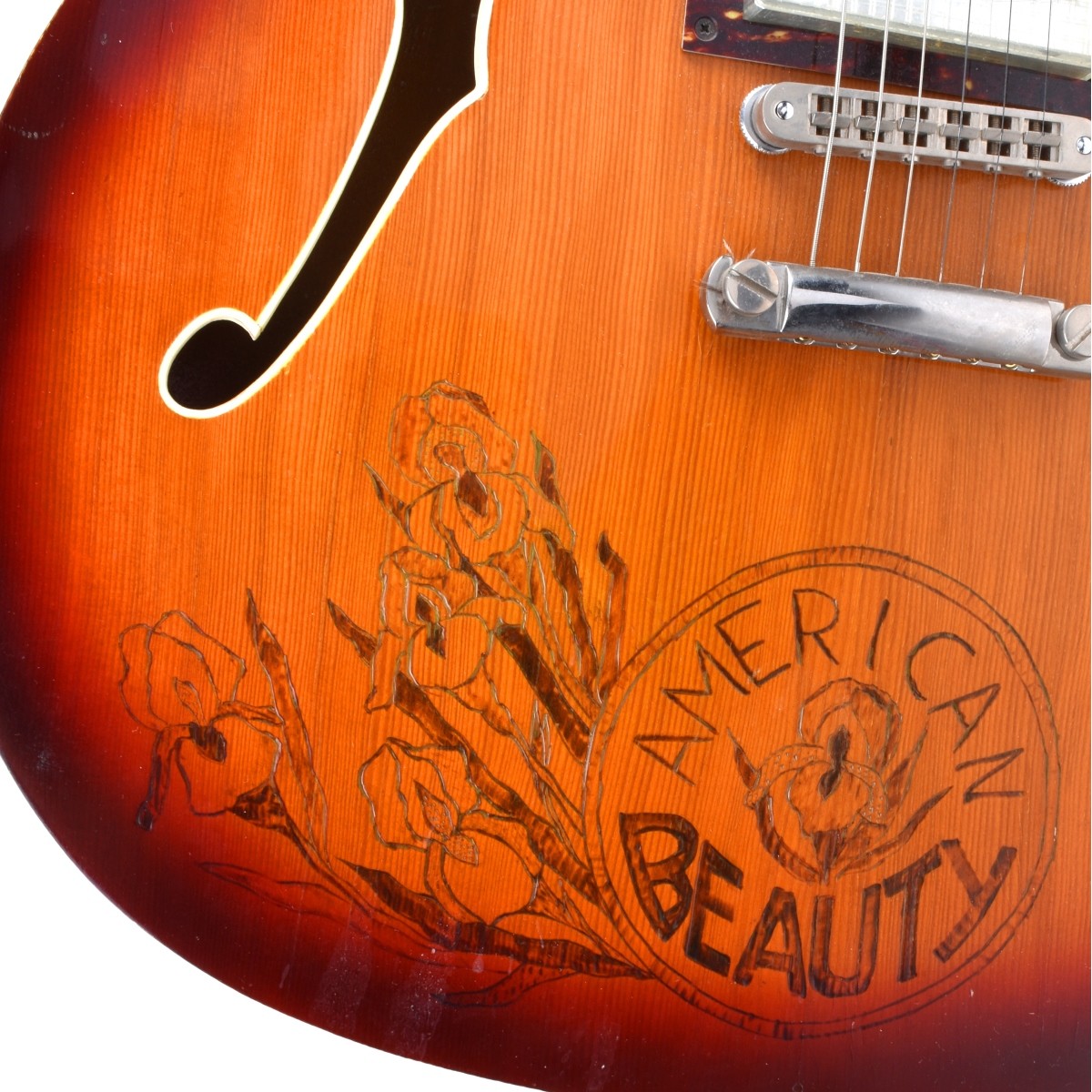 Vintage Semi-Hollow Body Electric Guitar. D'Angelico enter dip headstock and neck . Finished in a Honey Burst lacquer with inlaid mother of pearl position markers, ivoroid binding, faux tortoise underplates and acrylic tone and volume control knobs. After market carving "American Beauty" and decorative motif. Pickguard missing. No case. No serial # on the instrument. Measures 42-1/2" H x 17-1/4" W. Condition: Small losses to ivoroid, acrylic knobs yellowed and some small stress cracks in acrylic. A few dings on the body. screwholes visible on side and front from removed pickguard. Crazing on headstock. Estimate: $1000.00 - $2000.00 Domestic Shipping: Third party