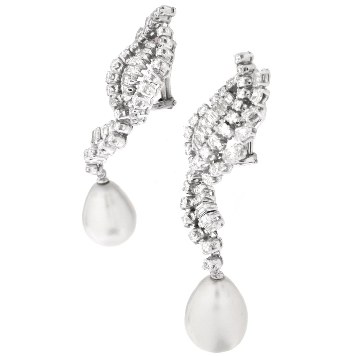 Vintage Approx. 8.0 Carat Multi Cut Diamond, Large South Sea Pearl and Platinum Earrings Diamonds F-G color, VVS-VS clarity. Pearls with good luster and polish measure 16mm x 13mm. Measure 2-3/8" L, 3/4" W. Approx. weight: 29.8 grams. Condition: Very good condition. Estimate: $6000.00 - $8000.00 Domestic Shipping: $32.00
