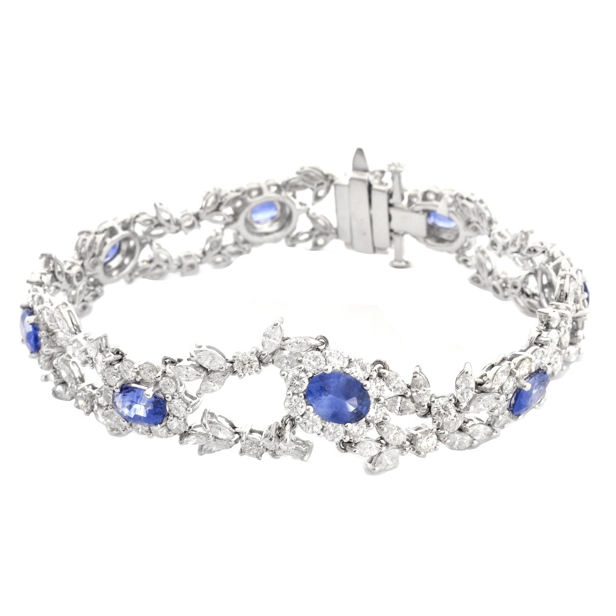 Approx. 8.50 Carat TW Round Brilliant Cut Diamond, 5.36 Carat Oval Cut Sapphire and 18 Karat White Gold Bracelet. Stamped 750. Measures 7-1/8" L, 1/2" W. Approx. weight: 21.9 grams. Condition: Very good condition. Estimate: $8500.00 - $10500.00 Domestic Shipping: $30.00