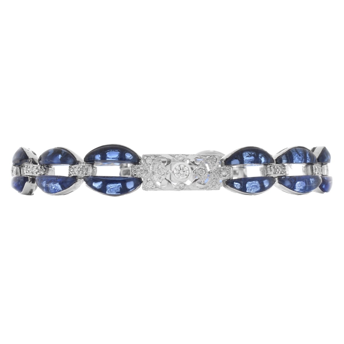 Approx. 10.80 Carat TW Sapphire, .72 Carat Diamond and 14 Karat White Gold Bracelet. Sapphires with vivid color. Stamped 585. Measures 7-1/8" L, 5/16" W. Approx. weight: 14.4 grams. Condition: Very good condition. Estimate: $1250.00 - $1450.00 Domestic Shipping: $30.00