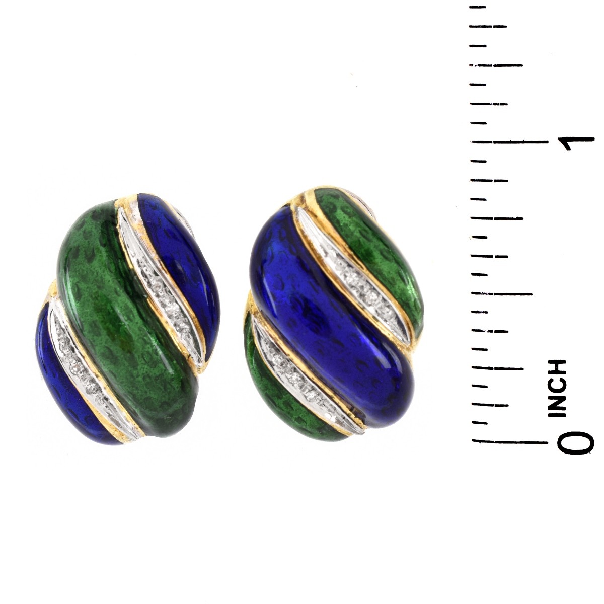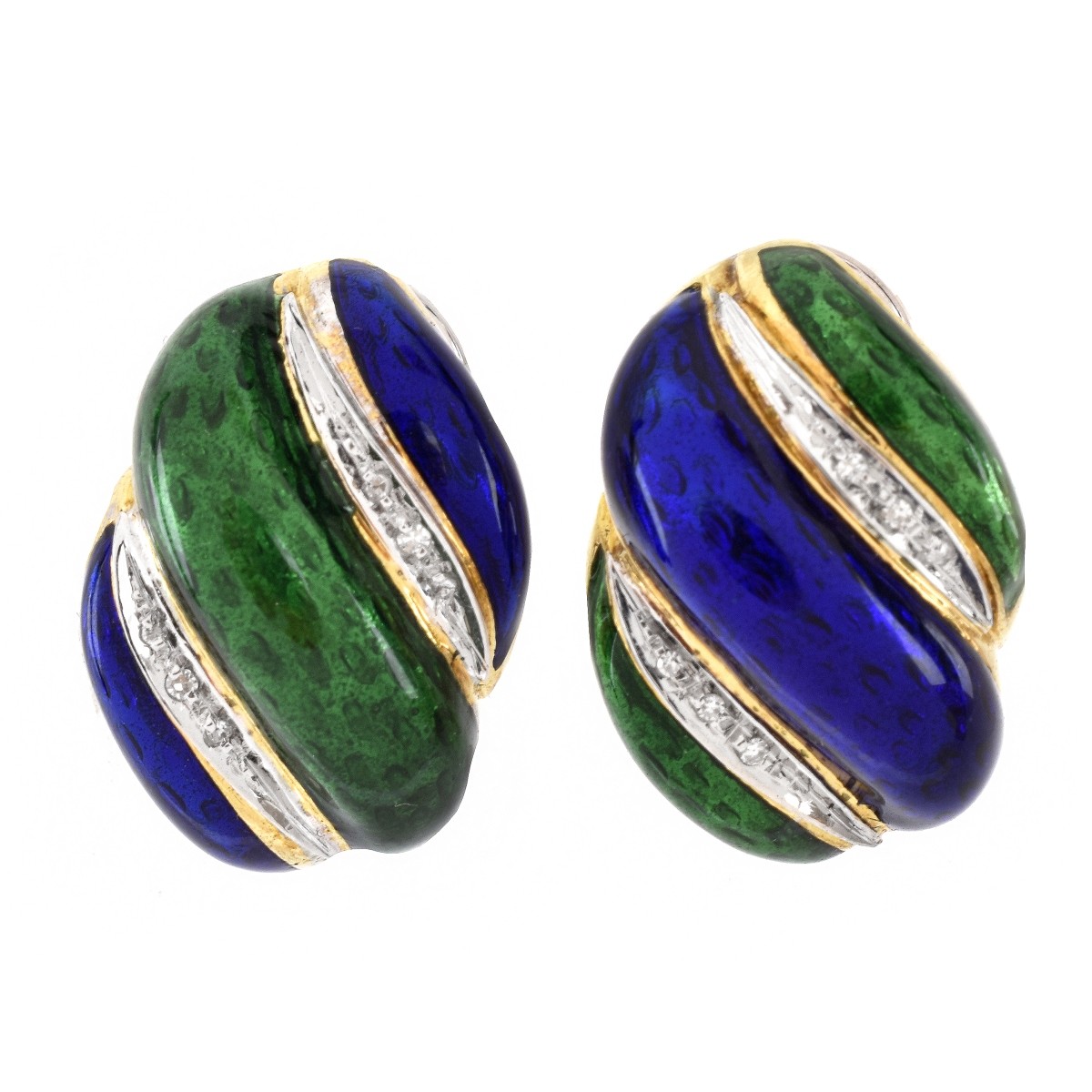 Vintage Italian Schlumberger style Approx. .15 Carat Diamond and Enameled 18 Karat Yellow Gold Earrings. Diamonds I color, SI1 clarity. Stamped Italy 18K. Measure 7/8" x 1/2". Approx. weight: 15.8 grams. Condition: Very good vintage condition. Estimate: $1000.00 - $1500.00 Domestic Shipping: $30.00