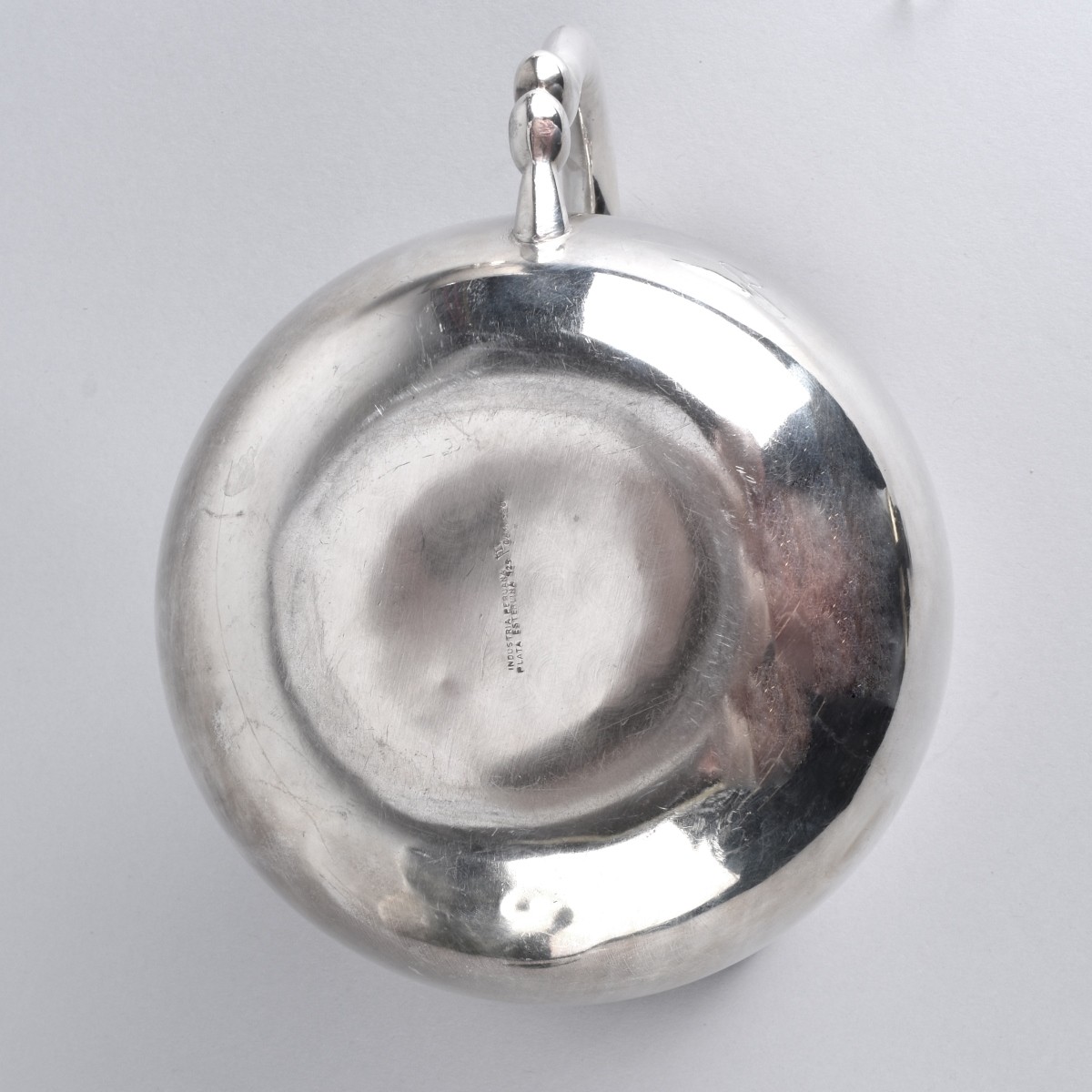 Camusso Sterling Silver Water Pitcher. Marked Industria Peruvian Sterling 925 Camusso to base. Measures 6-1/2" x 9-1/2". weighs approx. 16.91 troy ounces. Condition: a few minor dents, typical scuffs to base overall good condition Estimate: $150.000 - $250.00 Domestic Shipping: $58.00