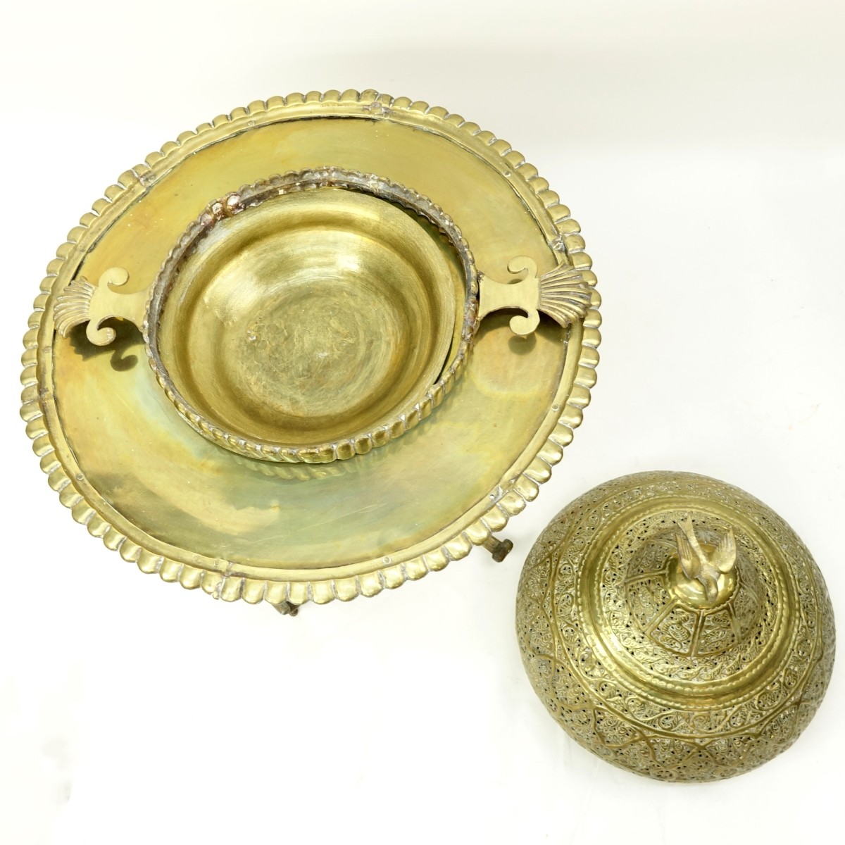 Vintage Moroccan Brass Tripod Standing Brazier with Cover. Measures 38" H x 25-1/2" Dia. Condition: Some oxidation, interior pan has some dents otherwise good condition Estimate: $200.00 - $400.00 Domestic Shipping: Third party