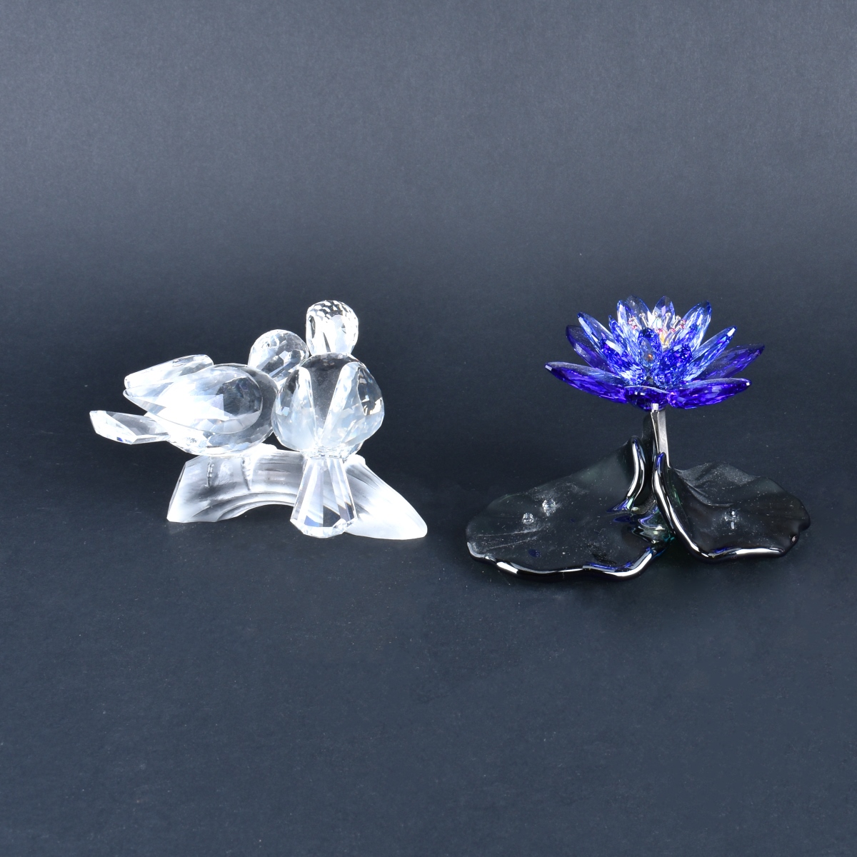 Four (4) Large Swarovski Figurines. Includes, fruit, flowers and birds. Signed. Tallest bird group measures 6-1/2" H. Condition: Good condition. Estimate: $200.00 - $400.00 Domestic Shipping: Third party