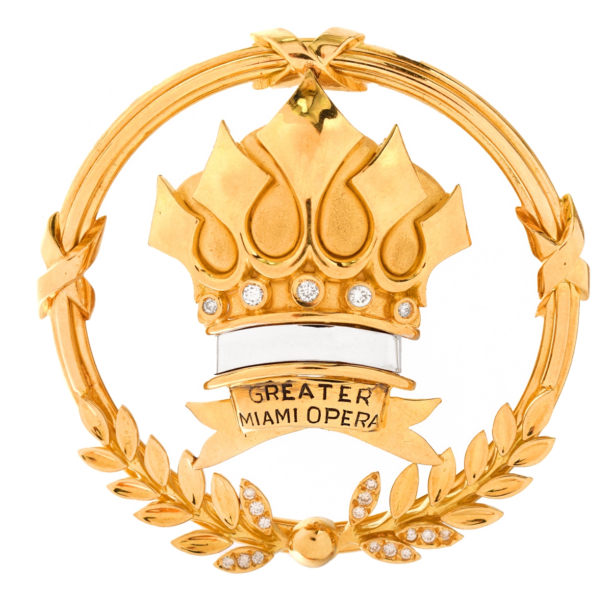 Vintage Mayor's Ned Bowman Heavy 18 Karat Yellow Gold Greater Miami Opera Crown and Laurel Wreath Brooch. Signed and stamped 18K. Inscribed dedication to Mrs. Frosene Sonderling. Measures 2-1/4" diameter. Approx. weight: 59.7 grams. Condition: Very good condition. Estimate: $2000.00 - $2500.00 Domestic Shipping: $30.00