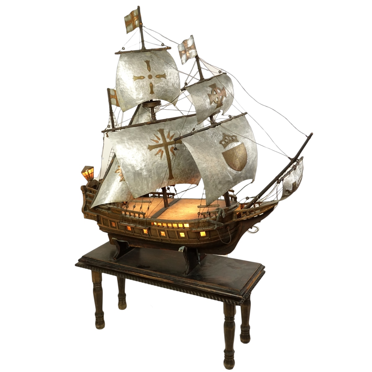 Antique Large Lighted Wood, Copper and Aluminum Spanish Galleon Model on Custom Wood Stand. Comprised mainly of hand hammered copper with large hammered aluminum sails and wood masts. Unsigned. Measures 64" H x 45" L. Condition: wear, rubbing. Estimate: $600.00 - $800.00 Domestic Shipping: Third party