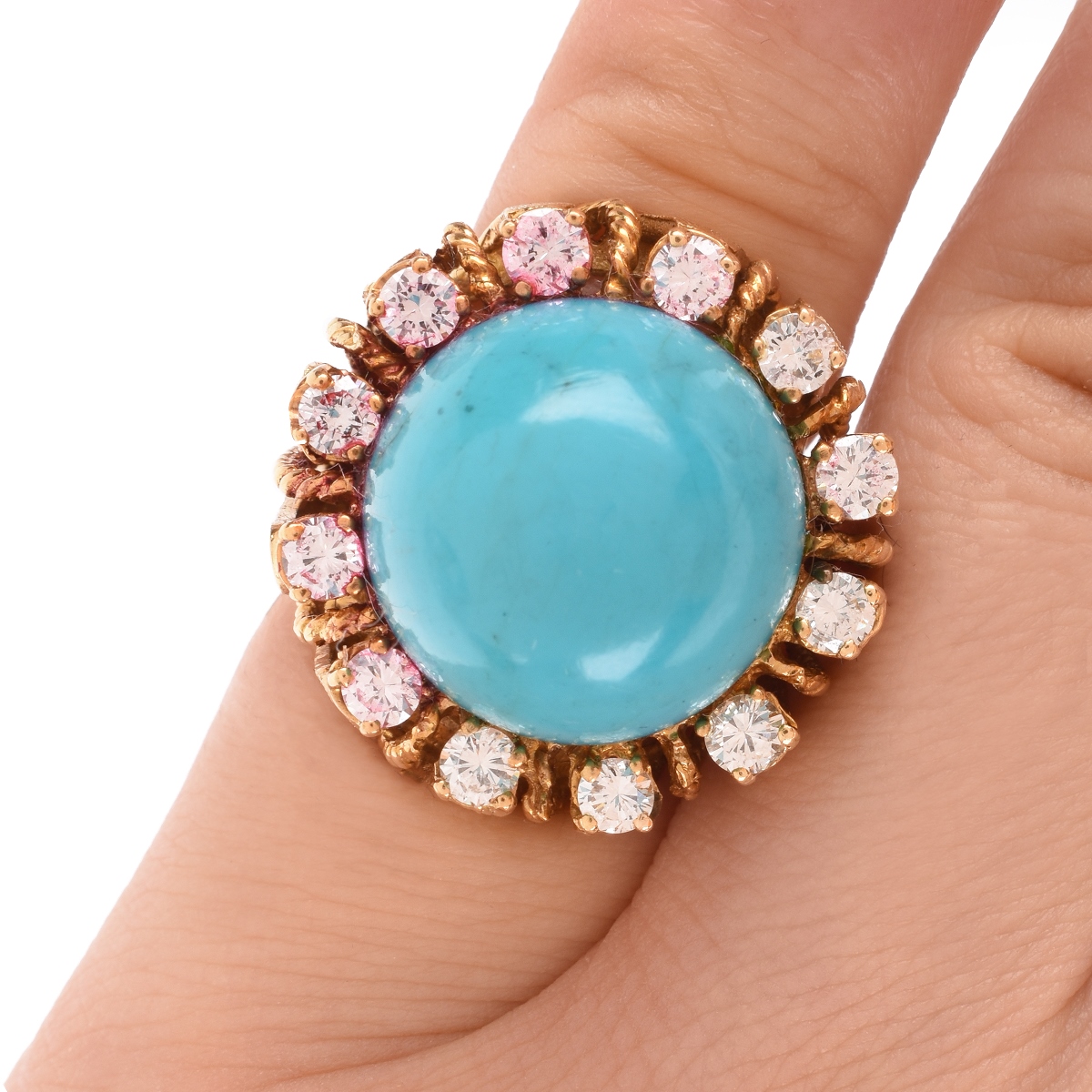 Vintage Cabochon Turquoise, Round Brilliant Cut Diamond and 14 Karat Yellow Gold Ring. Turquoise measures 17mm diam. Ring size 5. Approx. weight: 19.9 grams. Condition: Good vintage condition. Estimate: $600.00 - $800.00 Domestic Shipping: $28.00