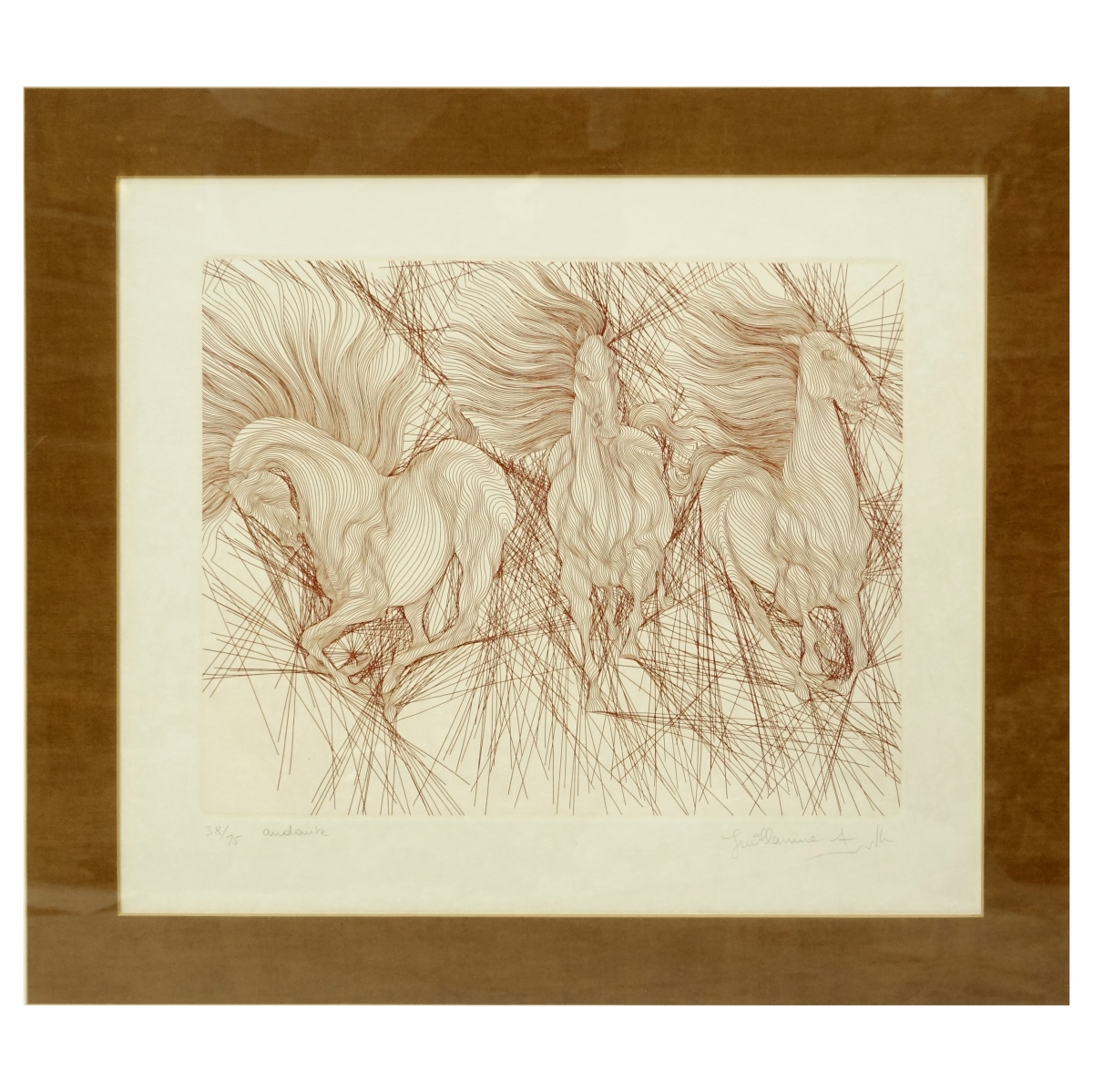 Guillaume Azoulay, Moroccan (born 1949) Colored Etching on Arches Paper "Andante" Pencil Signed, Title, and Numbered 38/75 on Lower Margin. Measures 20-3/4" H x 23" W, frame measures 26-1/2" H x 28-1/2" W. Condition: Good condition Estimate: $200.00 - $300.00 Domestic Shipping: Third party