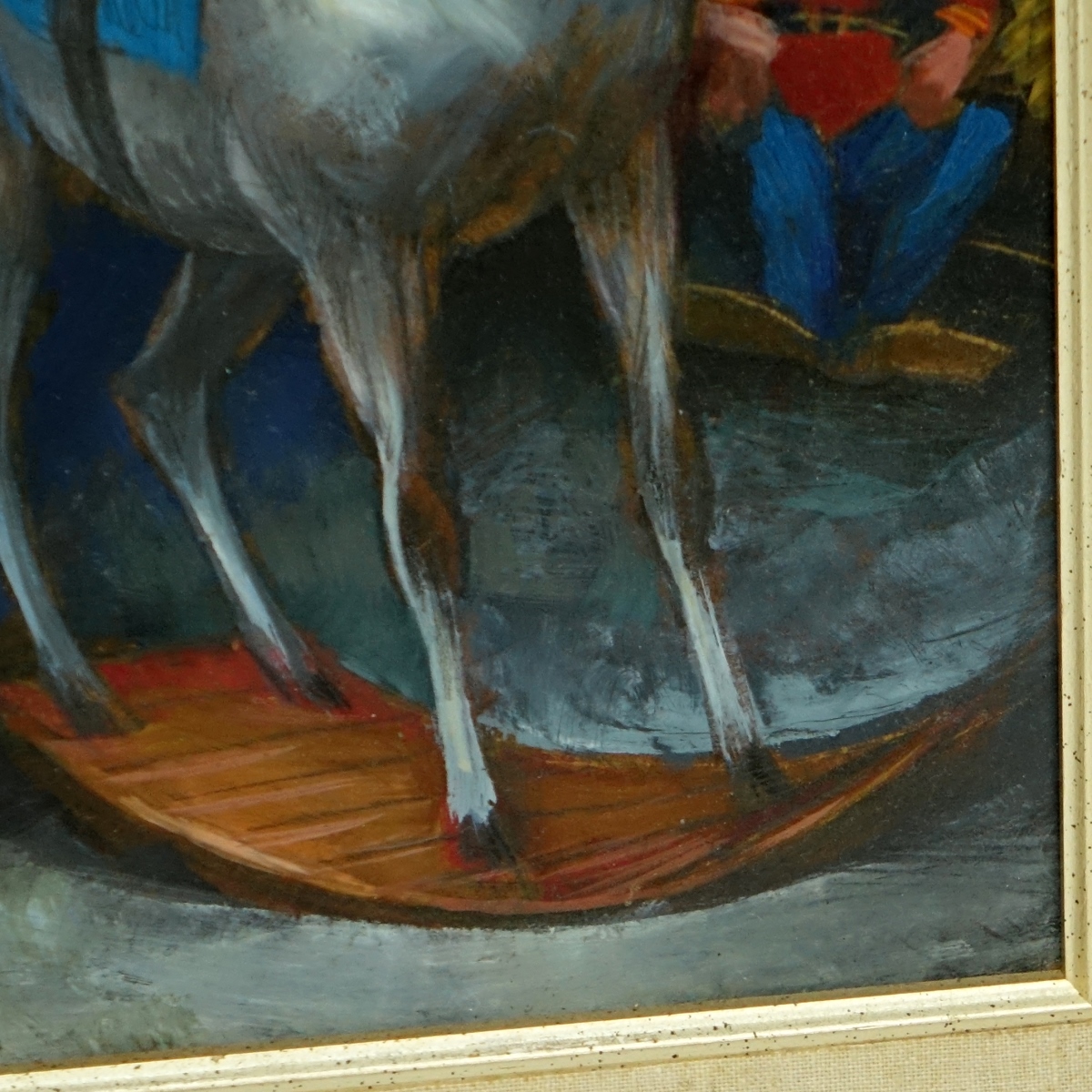 George Russin, American (1910-2010) Oil on masonite "Toy Seller". Signed lower left. Measures 24" x 20", frame measures 29" x 25". Condition: Good condition. Estimate: $300.00 - $500.00 Domestic Shipping: $165.00