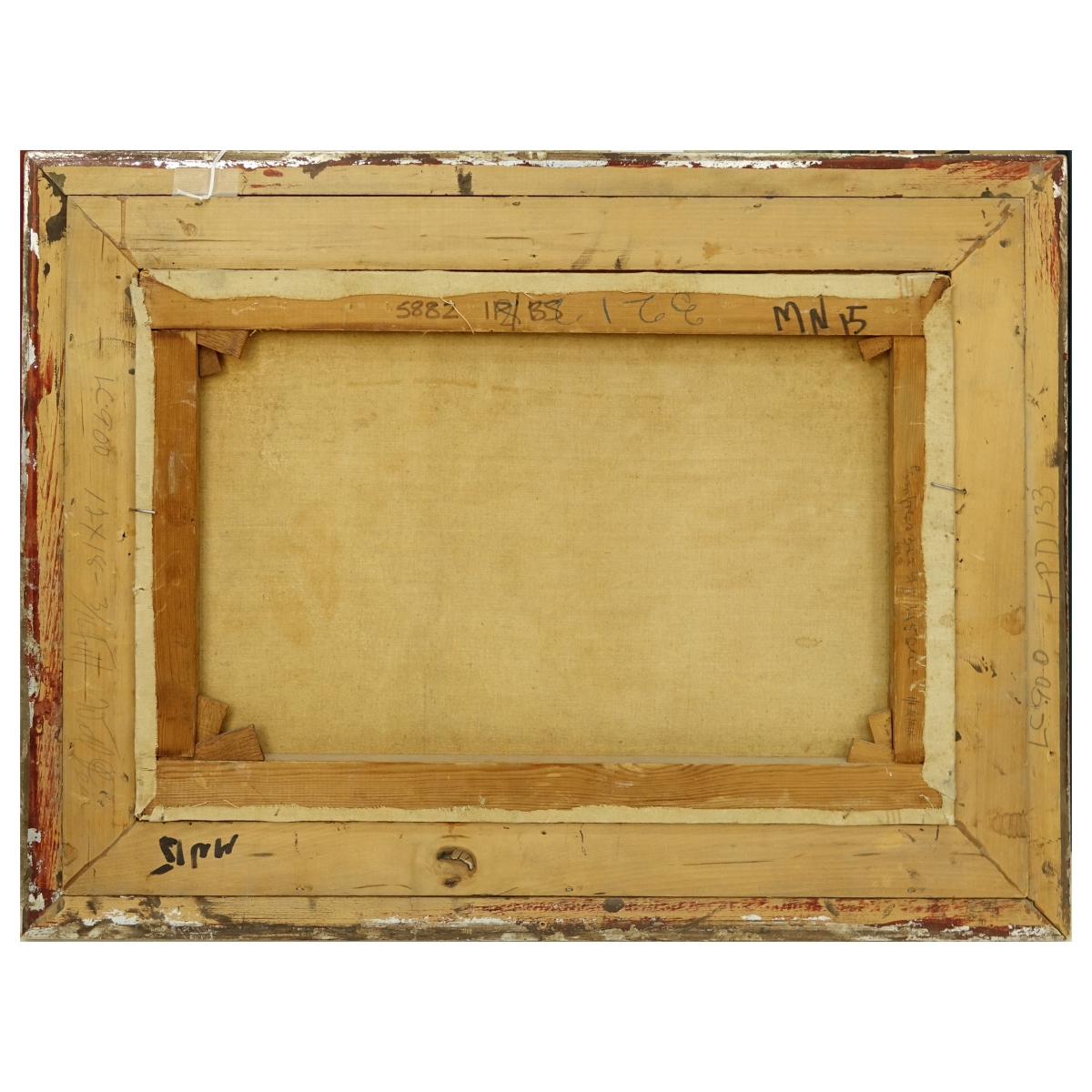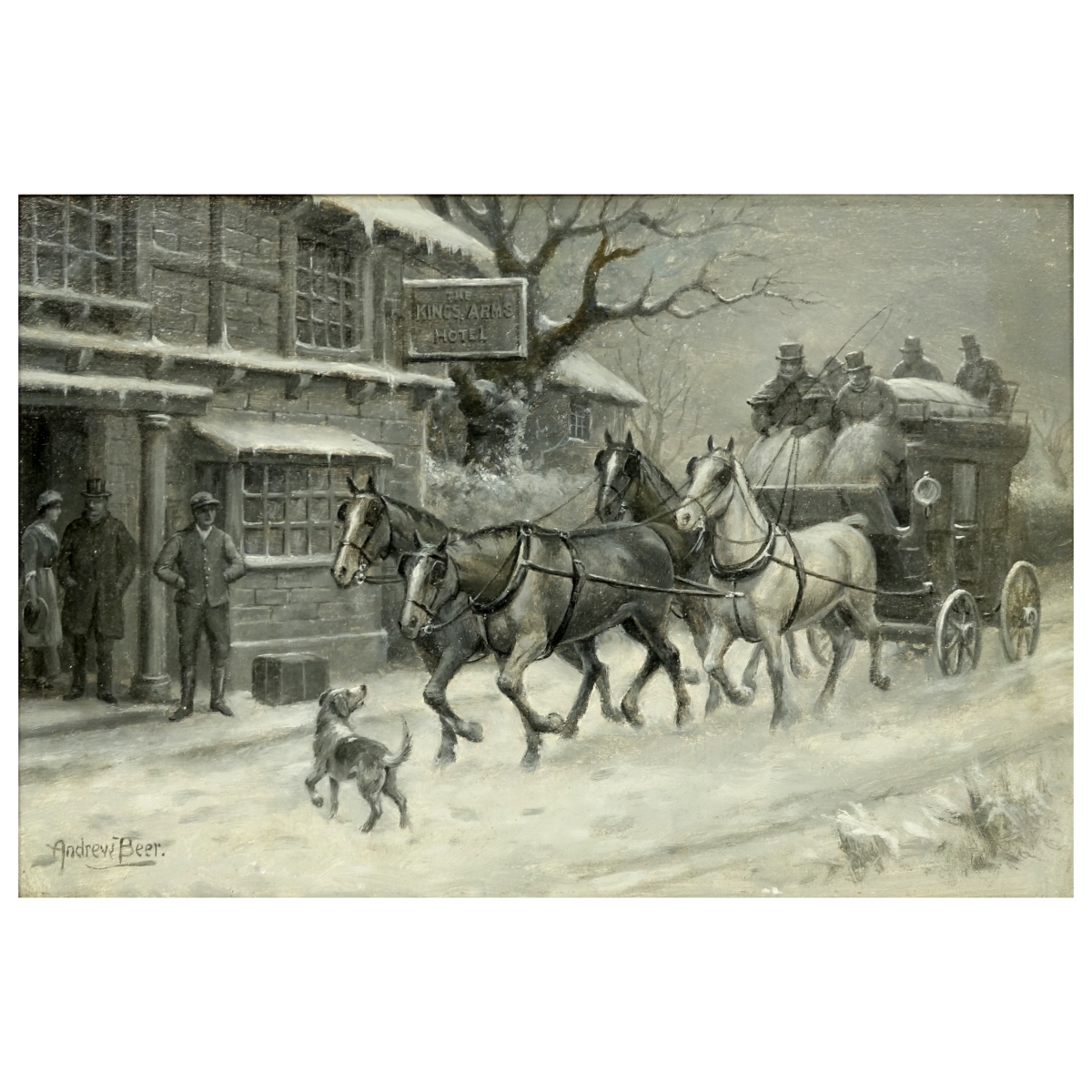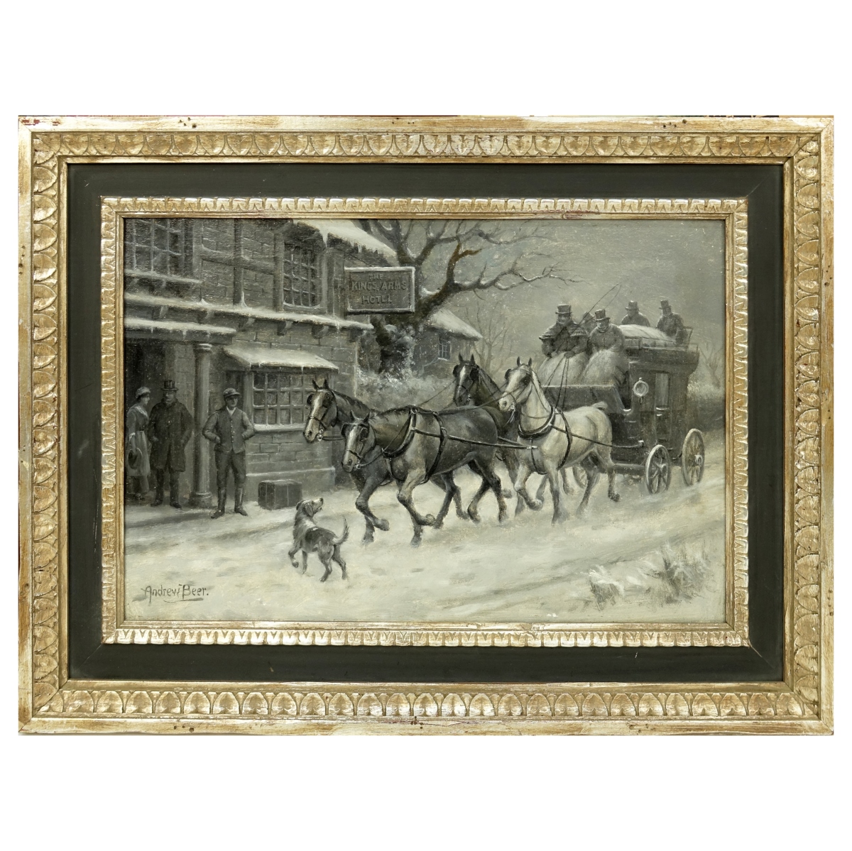 Andrew Beer, British (1862 - 1954) Oil on Canvas, Village Scene with Horse Drawn Carriage, Signed Lower Left. Measures 12" H x 18" W, frame measures 17-1/2" H x 23-1/2" W. Condition: Very small wear to canvas lower center Estimate: $100.00 - $200.00 Domestic Shipping: $115.00