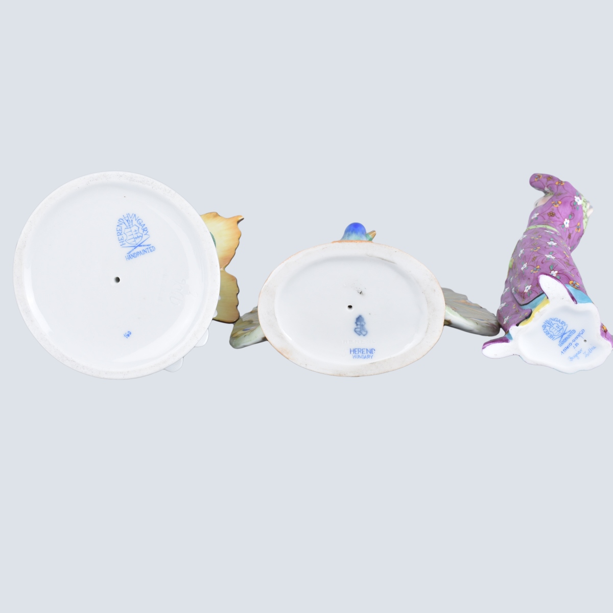 Three (3) Herend Porcelain Figurines. Includes: Dancing Persian #15410, Peacock, and Butterfly with Flowers #9506. Each appropriately marked and numbered. Dancing Persian measures 6-3/4" H, Peacock measures 4-3/8" H x 4-3/4" W. Condition: Butterfly figurine has a chip and dancers hand has been repaired otherwise good condition Estimate: $100.00 - $150.00 Domestic Shipping: $62.00