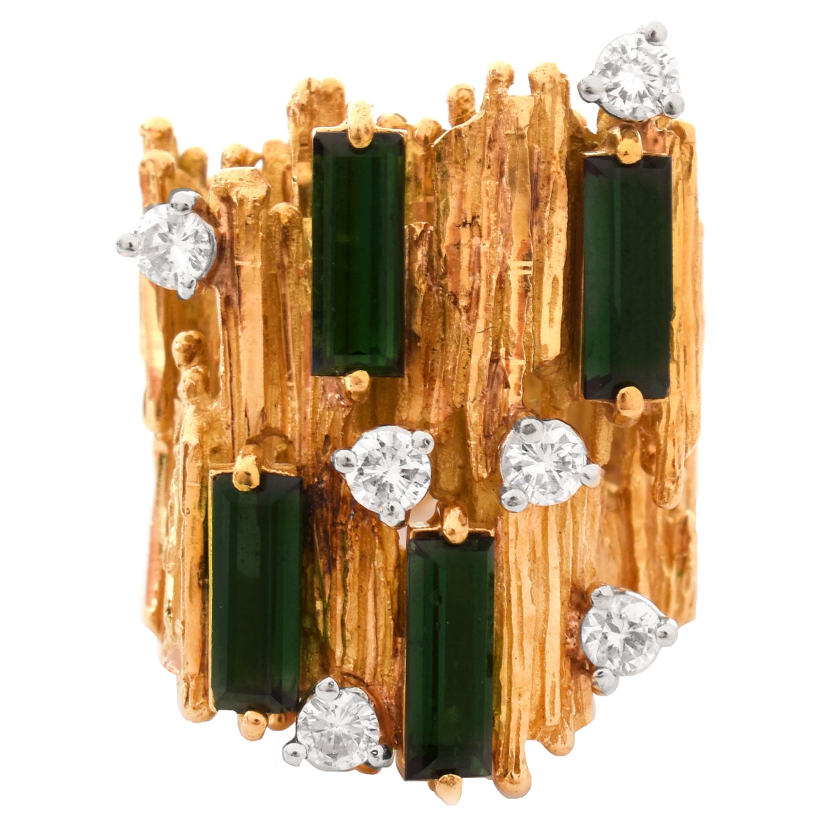 Retro Baguette Cut Green Tourmaline, Round Brilliant Cut Diamond and 18 Karat Yellow Gold Ring. Stamped 18K. Ring size 4. Approx. weight: 18.6 grams. Condition: Good vintage condition. Estimate: $500.00 - $700.00 Domestic Shipping: $28.00