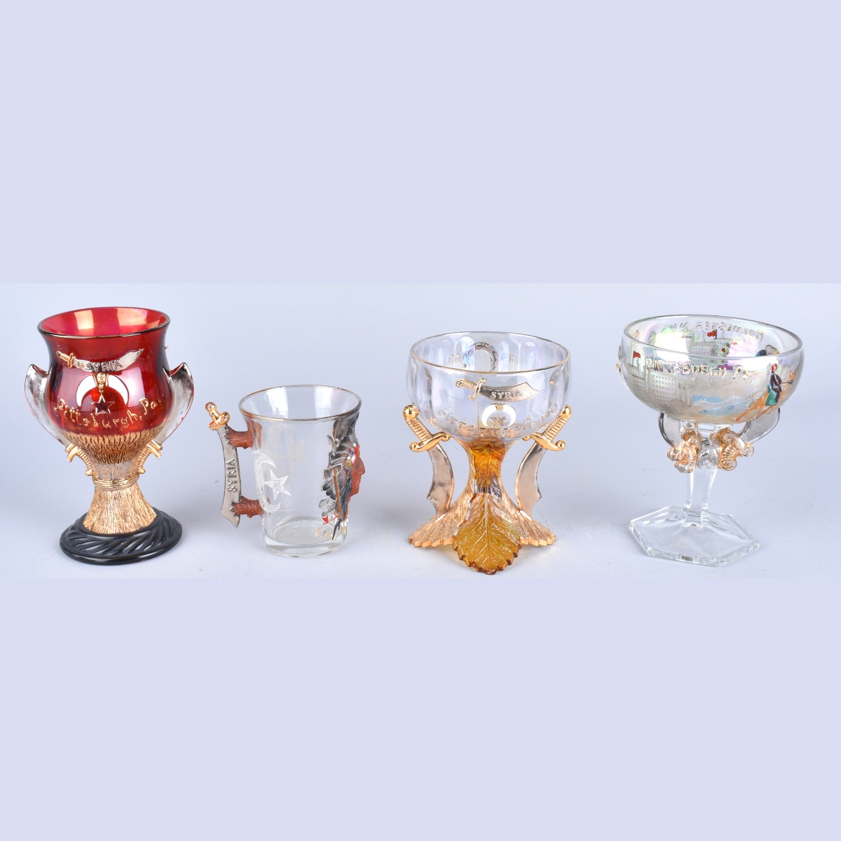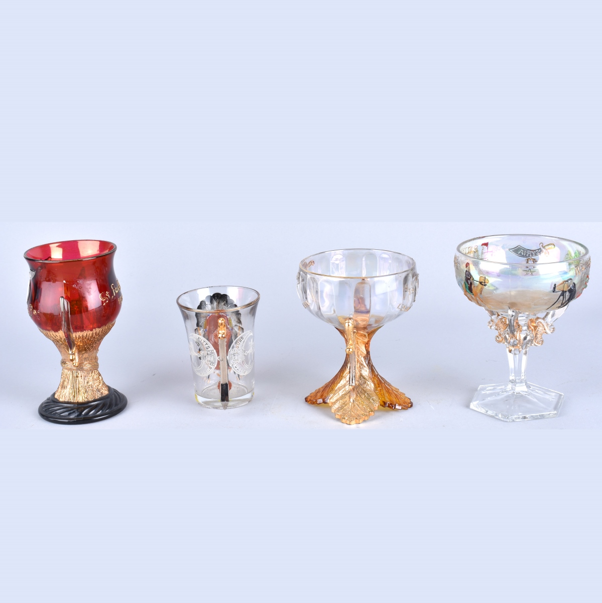 Collection of Four Commemorative Masonic Convention Glassware. Dated 1903, 1909, 1910, 1911. Largest measures 4-7/8" H, 3-3/4" W. Condition: Rubbing, otherwise good antique condition. Estimate: $50.00 - $100.00 Domestic Shipping: $38.00