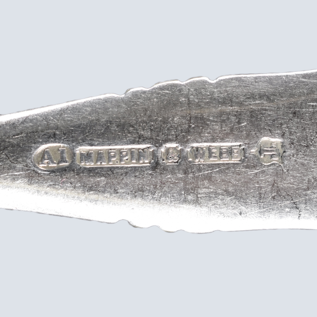 Grouping of Forty Seven (47) Assorted Silver Plated Flatware. Includes:12 forks size 8" and 8-1/4", 12 salad forks size 7" and 7-1/4", 11 tablespoons size 8-1/8" and 8-.3/4", 12 spoons size 7-1/8" and 7-3/8". makers include Mappin & Webb, Geislingin, and Sheffield. Box is for display purposes only. Condition: Good condition Estimate: $100.00 - $200.00 Domestic Shipping: $75.00