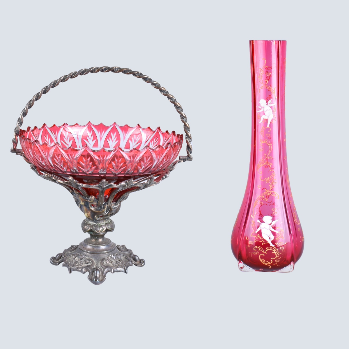 Victorian silver plate and cut cranberry glass basket. Unsigned. Measures 5-1/2" H x 6-1/2" W. Also included an enameled cranberry glass vase. Unsigned. Measures 16-1/4" H x 4-1/2" W. Condition: Chips, wear. Estimate: $100.00 - $200.00 Domestic Shipping: $88.00