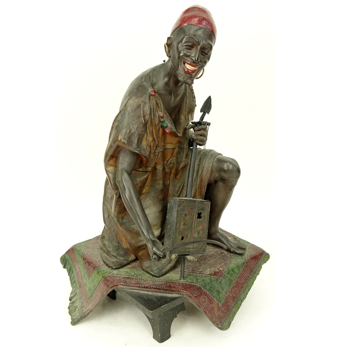 19th Century Orientalist French Polychrome Spelter Arab Musician. Unsigned. Measures 17-7/8" H. Condition: Rubbing, loss to carpet on obverse side Estimate: $300.00 - $500.00 Domestic Shipping: Third party