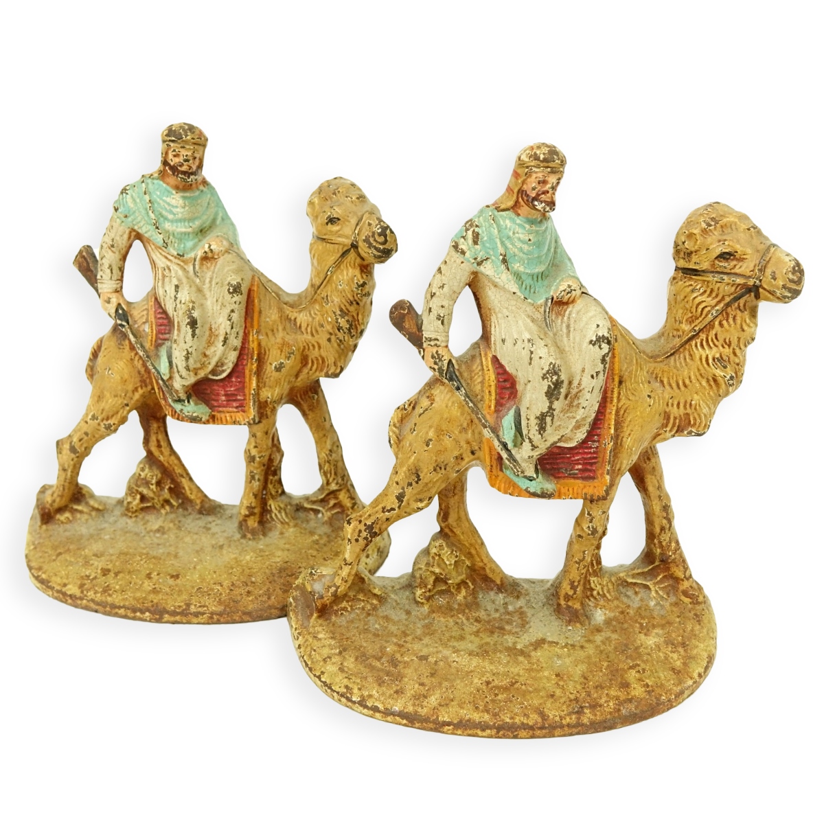 Pair of Polychrome Cast Iron Bookends, Arabs on Horseback. Numbered 418 en verso. Measures 5-3/4" H x 5" W. Condition: Rubbing, oxidation Estimate: $50.00 - $100.00 Domestic Shipping: $58.00