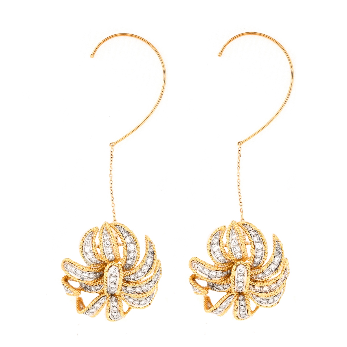 Fine Quality Vintage Approx. 12.0-14.0 Carat Round Brilliant Cut Diamond, Platinum and 18 Karat Yellow Gold Pendant / Brooch and Earring Suite. Diamonds D-E-F color, VS1-VS2 clarity. Stamped 18K M.B. Brooch measures 2-3/8" L, 2-1/8" W; earrings measure 1-1/2" diameter. Approx. total weight: 106.2 grams. Condition: Very good condition. Estimate: $6000.00 - $8000.00 Domestic Shipping: $34.00