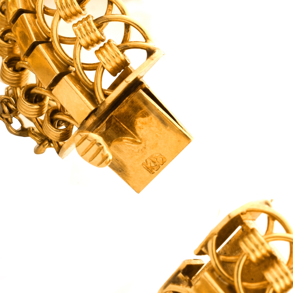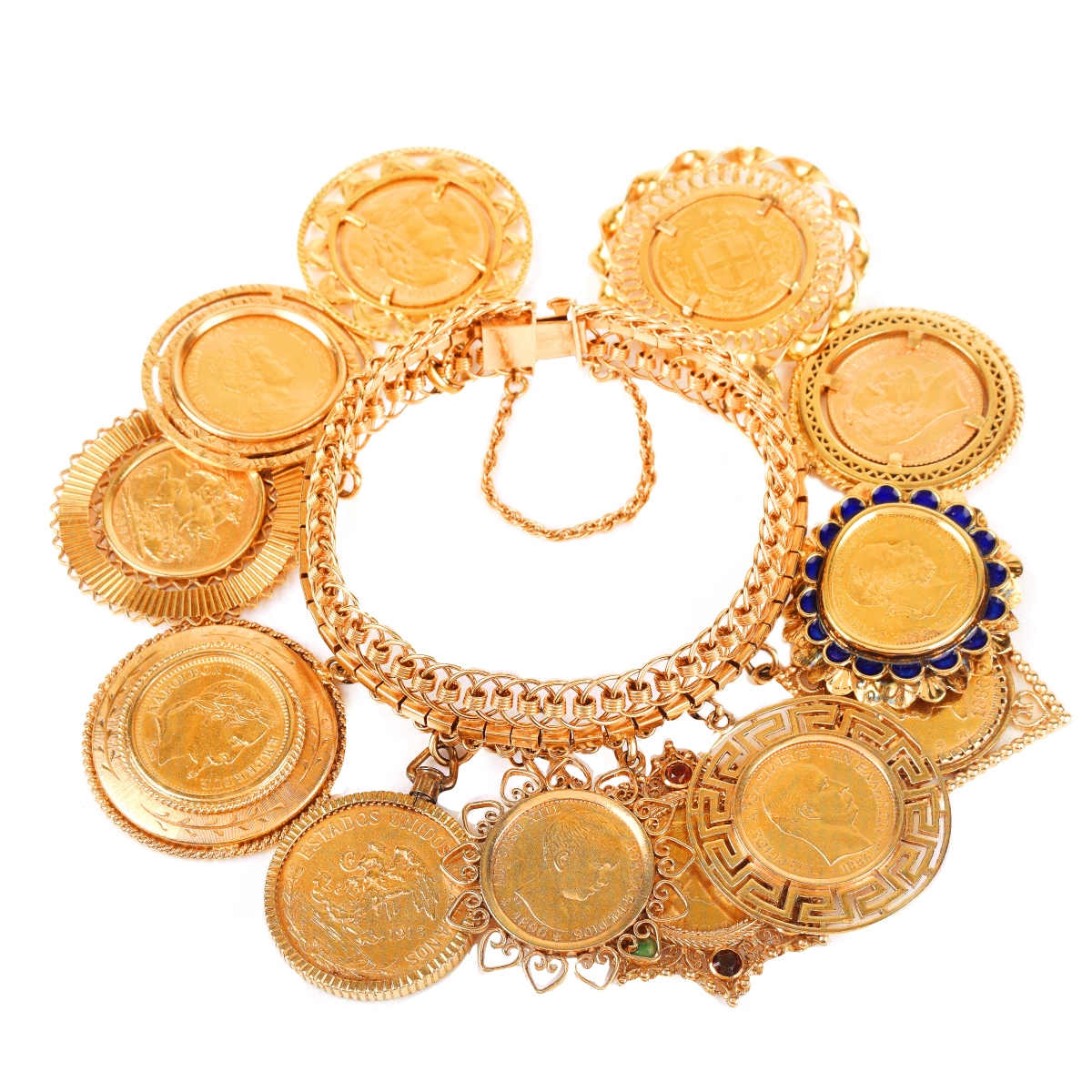 Vintage 18 Karat Yellow Gold Charm Bracelet with Twelve (12) Gold Coin Charms Including Coins from France, Switzerland, England, Spain, USA, Mexico and others. One charm with small gemstone accents. Clasp stamped 18K. Bracelet measures 7-3/8" L; largest charm measures 1-1/2" diameter. Approx. weight: 198.0 grams. Condition: Good vintage condition. Estimate: $6000.00 - $8000.00 Domestic Shipping: $34.00