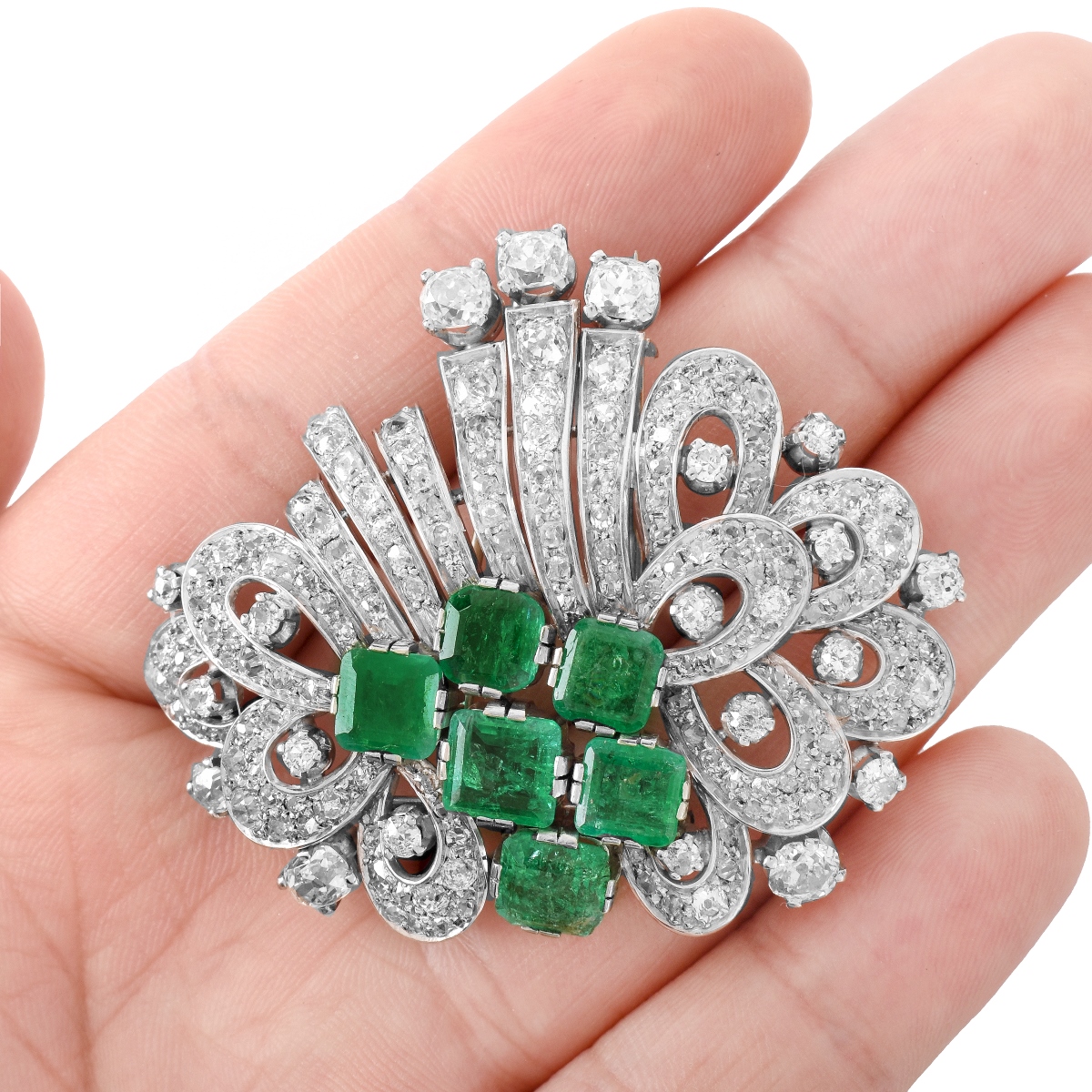 Art Deco Approx. 10.0 Carat TW Old European Cut Diamond, 9.0 Carat Colombian Emerald and Platinum Brooch. Emeralds with vivid color. Measures 1-7/8" H, 2-1/4" W. Approx. weight: 33.5 grams. Condition: Very good condition. Estimate: $8000.00 - $10000.00 Domestic Shipping: $30.00