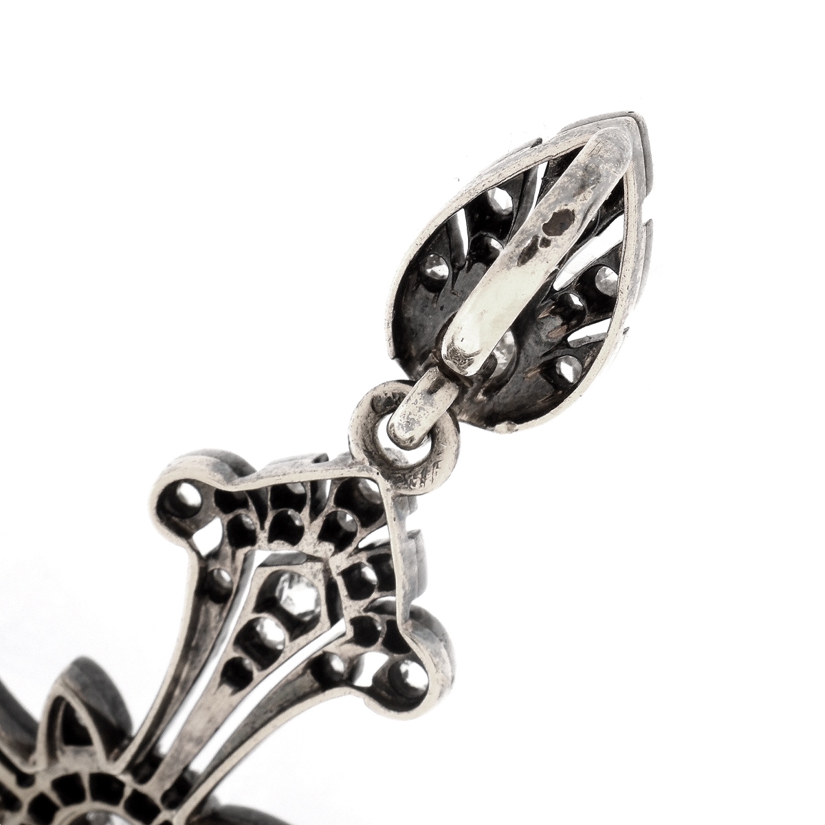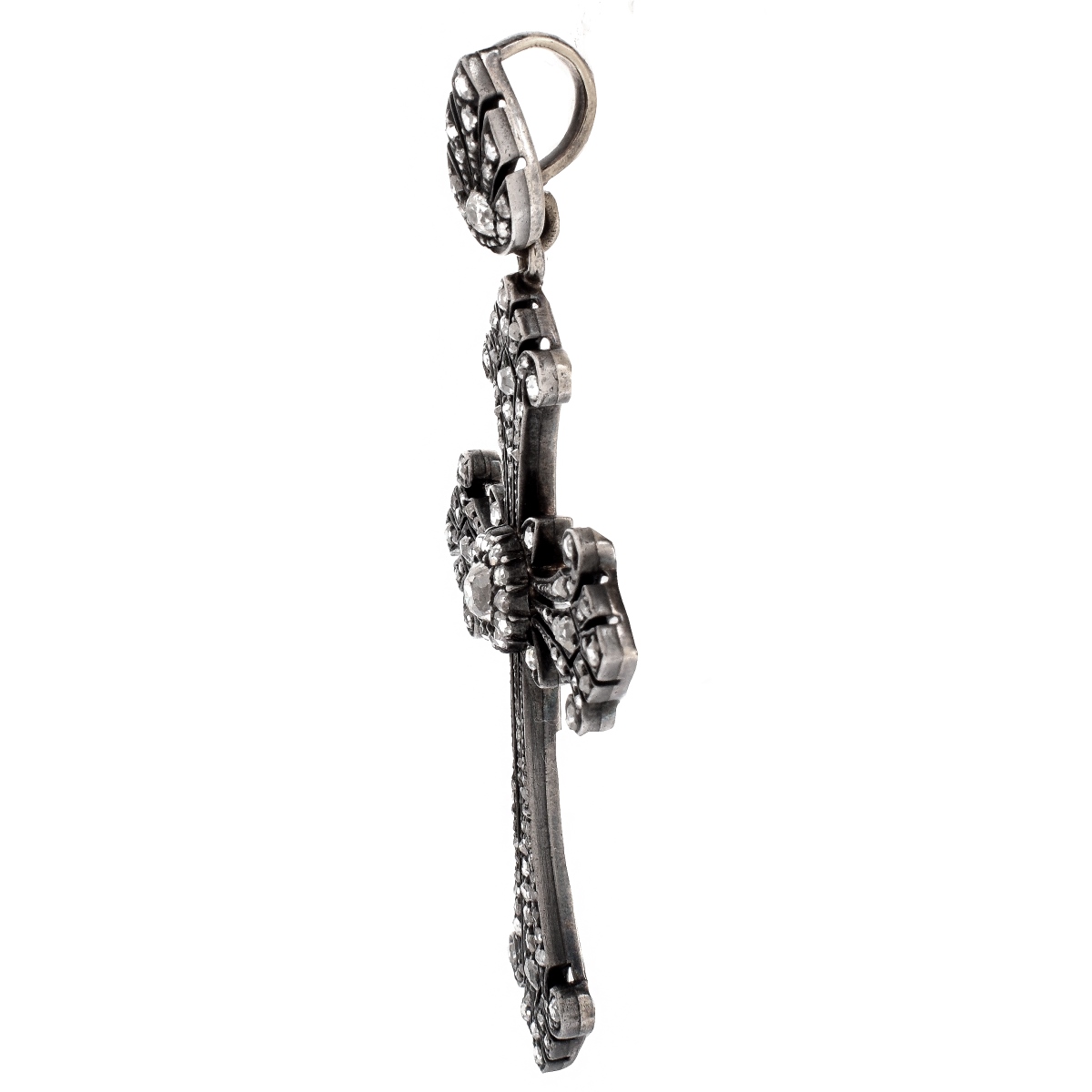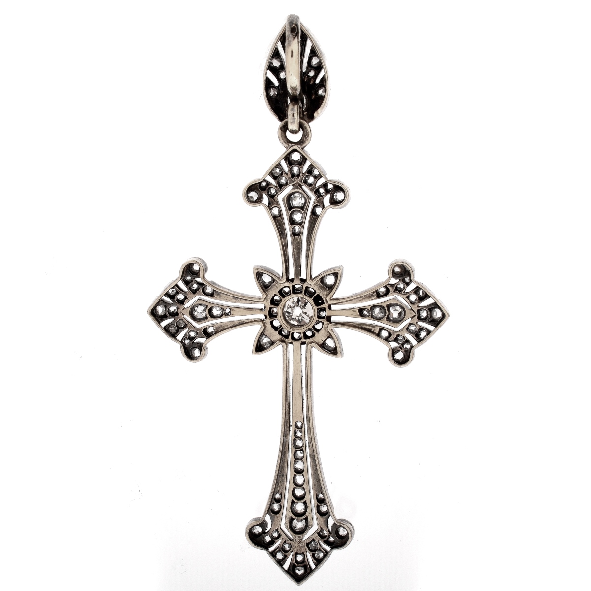 Antique French Old European Cut and Rose Cut Diamond, 18 Karat Yellow Gold and Silver Cross Pendant. Unsigned. Measures 3" L, 1-1/2" W. Approx. weight: 12.6 grams. Condition: Very good antique condition. Estimate: $4000.00 - $6000.00 Domestic Shipping: $28.00