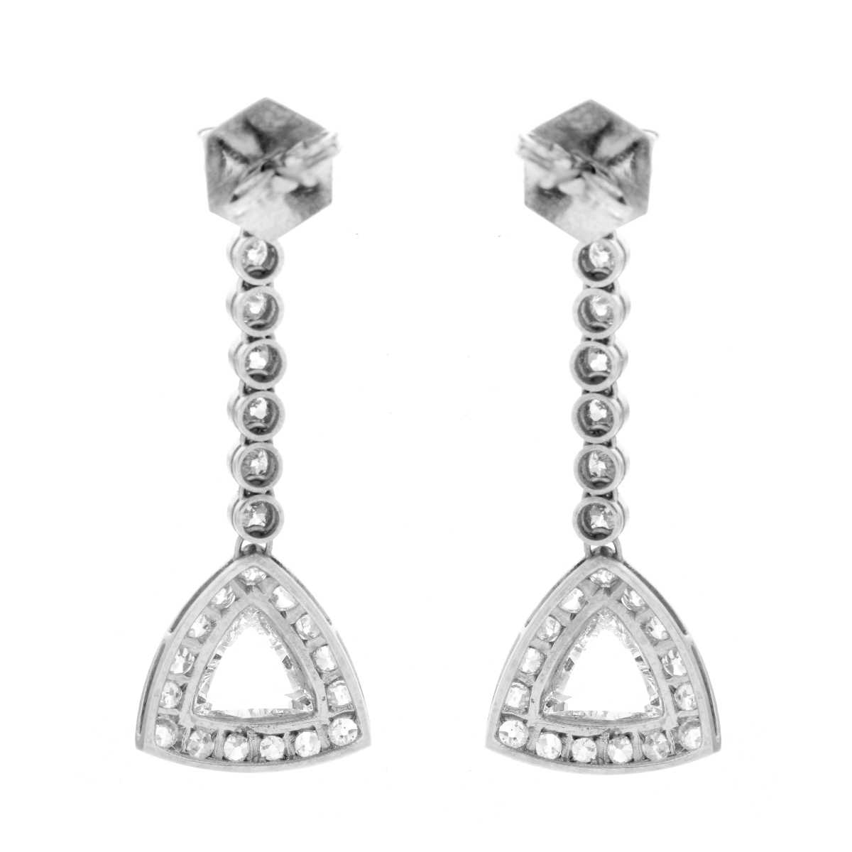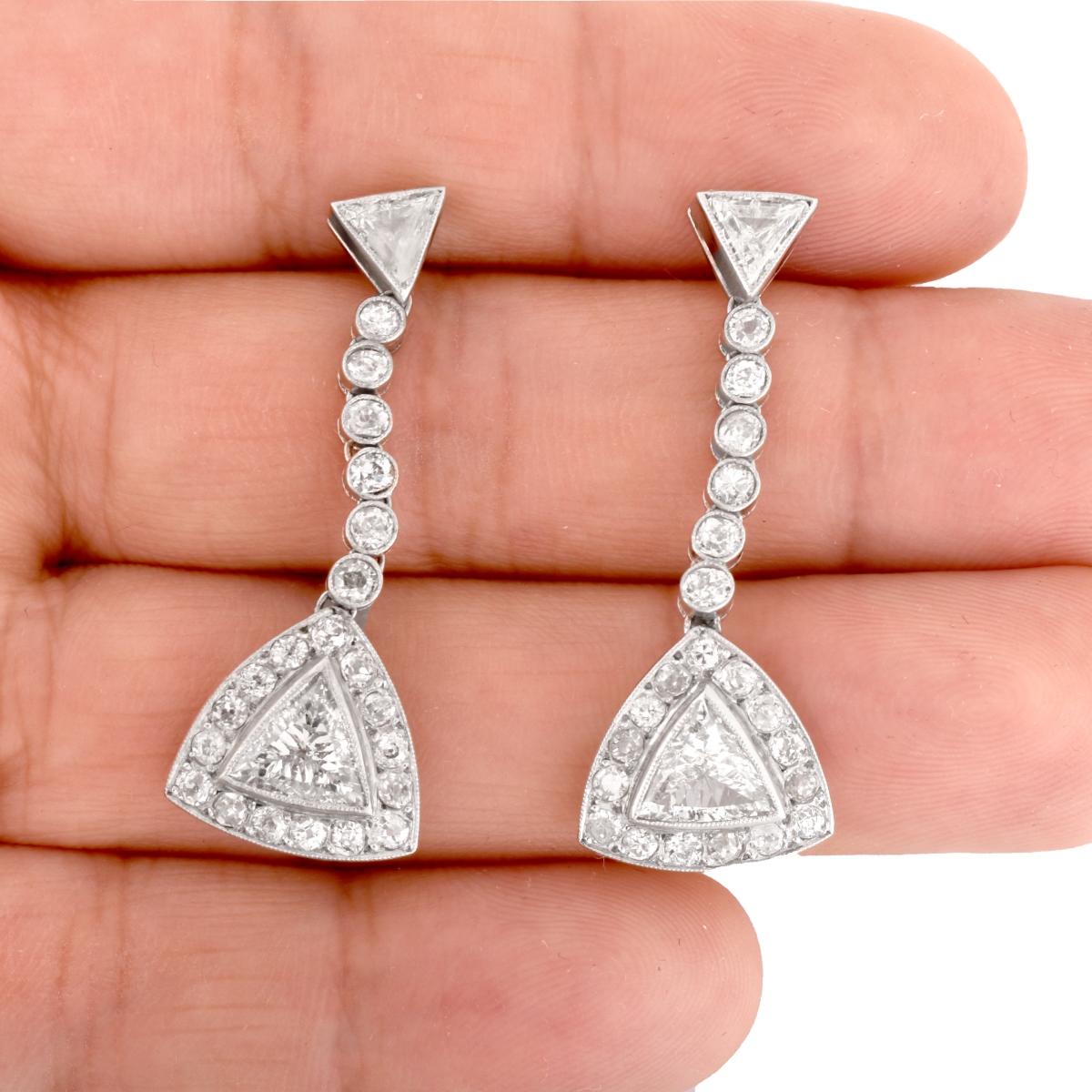 Vintage Approx. 4.89 Carat TW Diamond and Platinum Pendant Earrings Set with a .89 carat triangular shape diamond G color, SI1 clarity and a .79 carat triangular shape diamond F color, SI2 clarity. Further accented with 3.21 carats TW triangular and old European cut diamonds. Measure 1-1/2" L, 9/16" W. Approx. weight: 9.2 grams. Condition: Very good condition. Estimate: $9000.00 - $12000.00 Domestic Shipping: $30.00