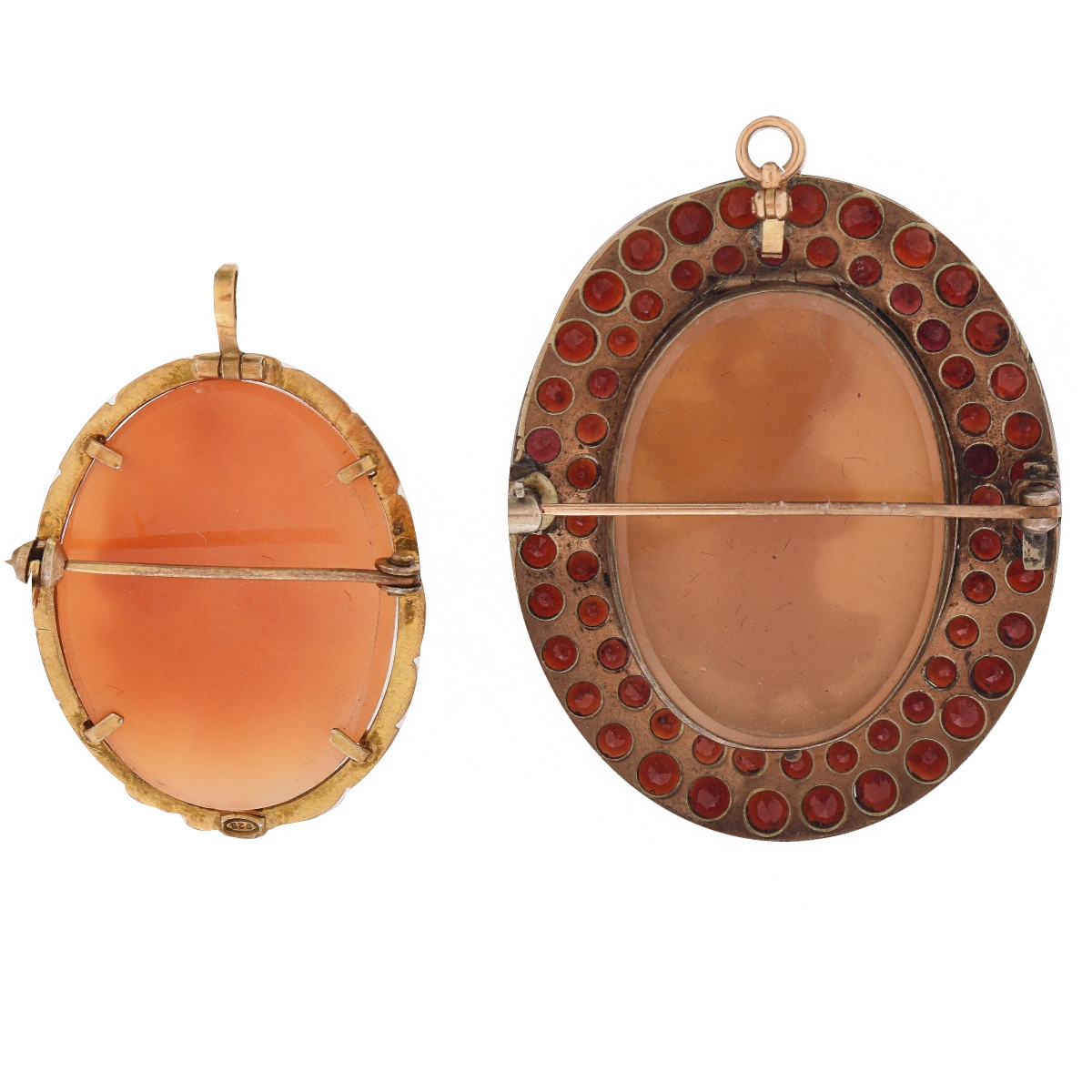 Two (2) Antique Carved Shell Cameo and Vermeil Pendant / Brooches, One Set with Oval and Round Cut Garnets. One stamped 925. Larger measures 1-3/4" H, 1-1/2" W. Approx. weight: 19.2 grams. Condition: Good antique condition. Estimate: $150.00 - $250.00 Domestic Shipping: $30.00