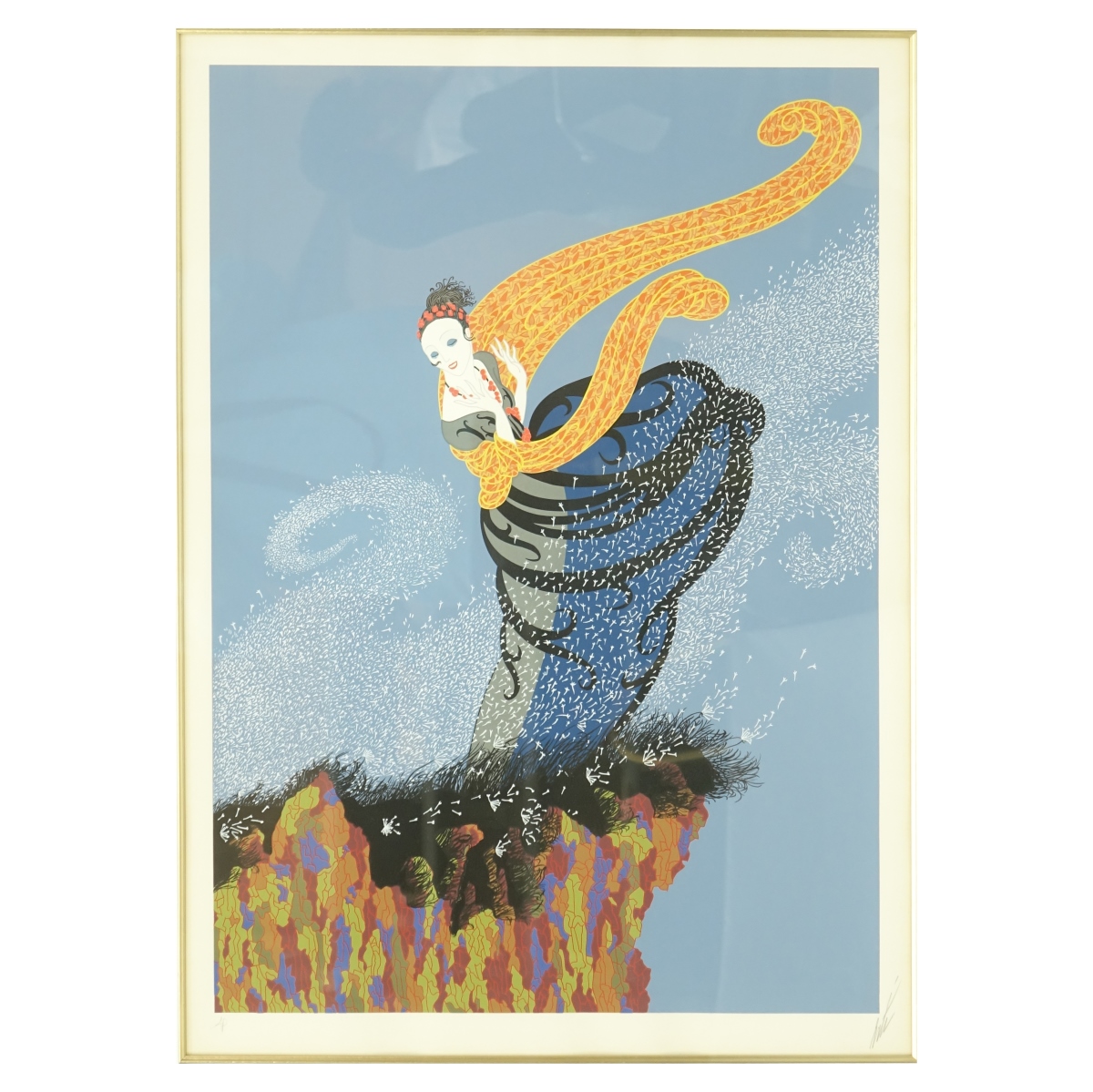 Erte, French (1892 - 1990) Artist Proof Color Serigraph on Paper "Summer Breeze 1978" Pencil Signed and Marked "AP" on Lower Margin. 1978 Circle of Fine Arts Corp impressed mark lower right. Measures 28-1/2" H x 20-1/2" W, frame measures 38-1/4" H x 30" W. Condition: Light toning on margin otherwise good condition Estimate: $300.00 - $500.00 Domestic Shipping: Third party