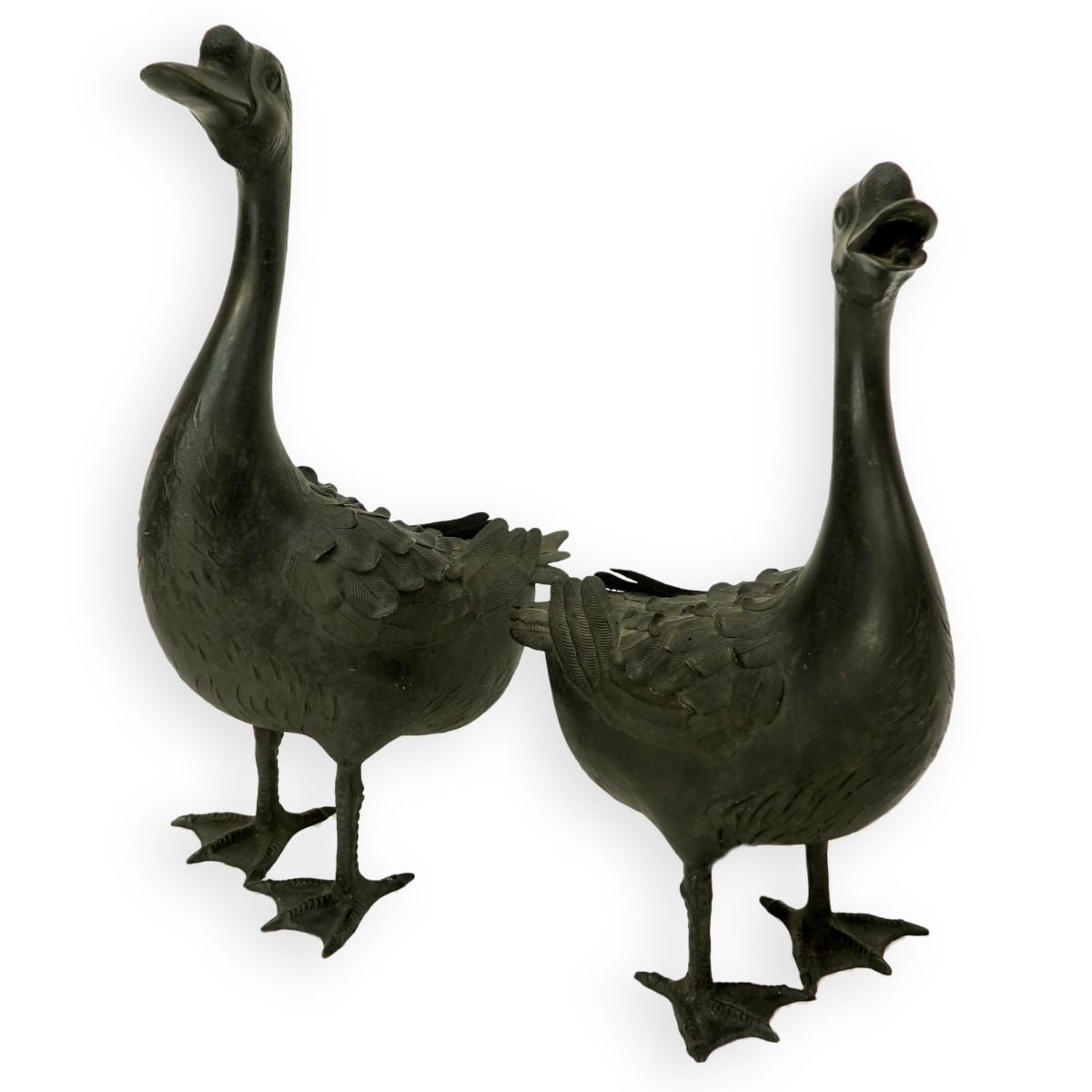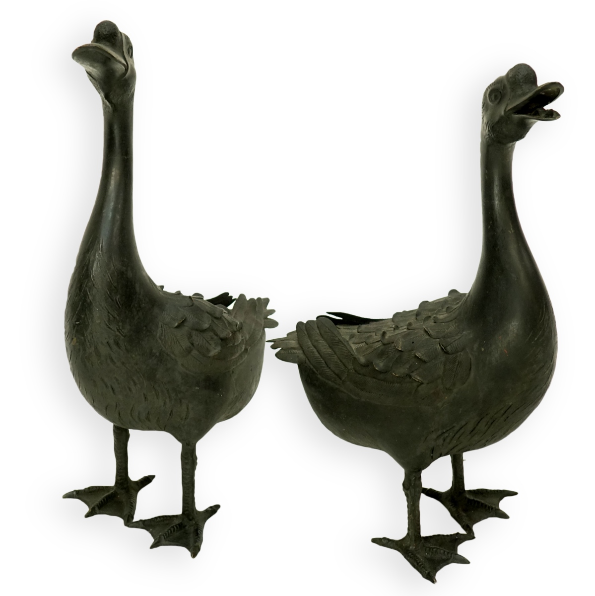 Pair of Large Antique Japanese Bronze Duck Sculptures. Marked "Japan" to the base of each feet. Measures 18" x 6" x 11". Condition: Rubbing overall good condition Estimate: $300.00 - $400.00 Domestic Shipping: Third party