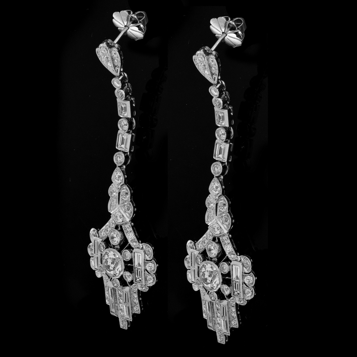 Art Deco Approx. 11.65 Carat Old European Cut Round and Baguette Diamond and Platinum Chandelier Earrings. Diamonds F-G color, VS1-SI1 clarity. Measure 3" L, 1" W. Approx. weight: 27.0 grams. Condition: Very good vintage condition. Estimate: $20000.00 - $25000.00 Domestic Shipping: $32.00