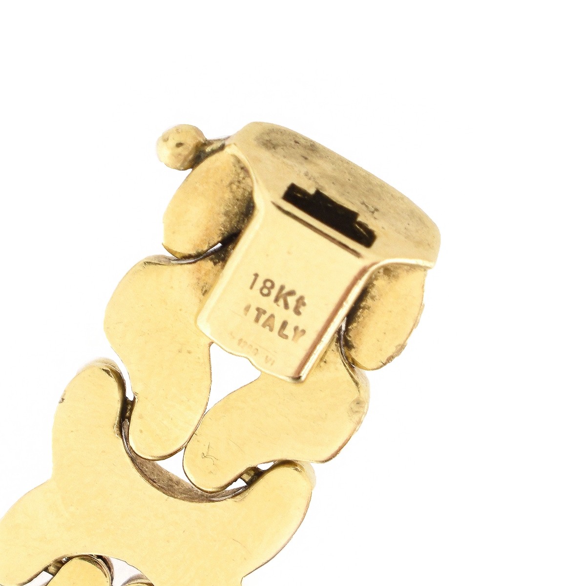 Vintage Italian 18 Karat Yellow Gold Flexible Link Bracelet. Stamped Italy, 18K, hallmark. Measures 7" L, 3/8" W. Approx. weight: 23.5 grams. Condition: Very good vintage condition. Estimate: $200.00 - $400.00 Domestic Shipping: $30.00