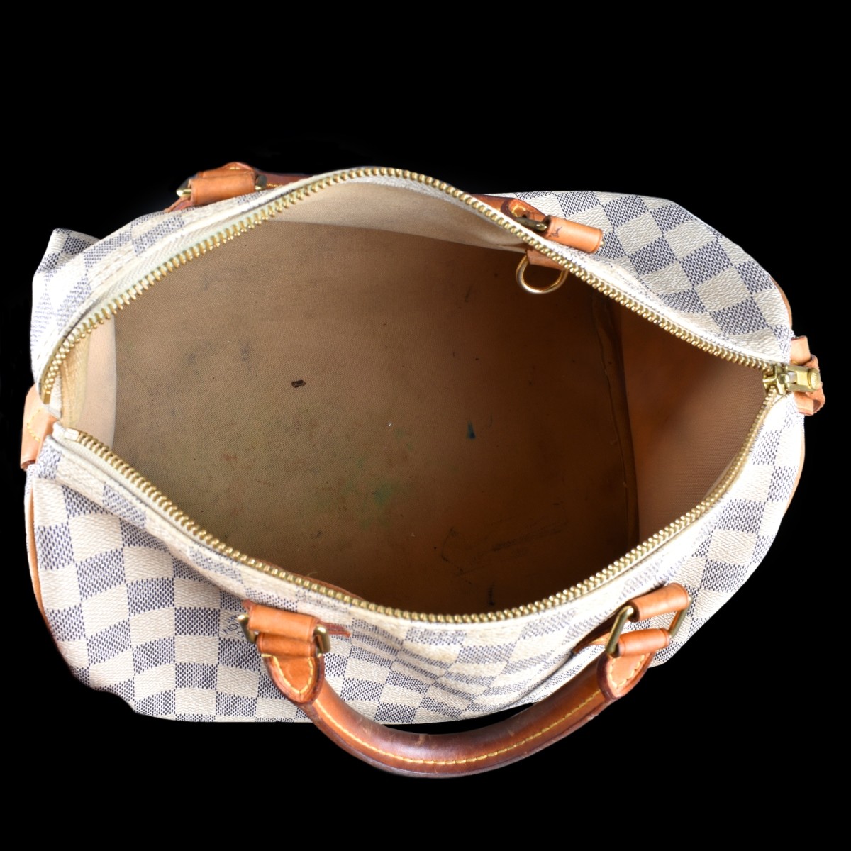 Louis Vuitton Damier Azur Speedy 30 Bag. Golden brass hardware, vachetta leather. Beige interior. Lock & Key, Dustbag included. Labeled appropriately. Measures 12" x 8-1/4" x 7". Condition: Used good condition with toning to leather, lightly soiled and wear from use and age. Estimate: $300.00 - $400.00 Domestic Shipping: $58.00
