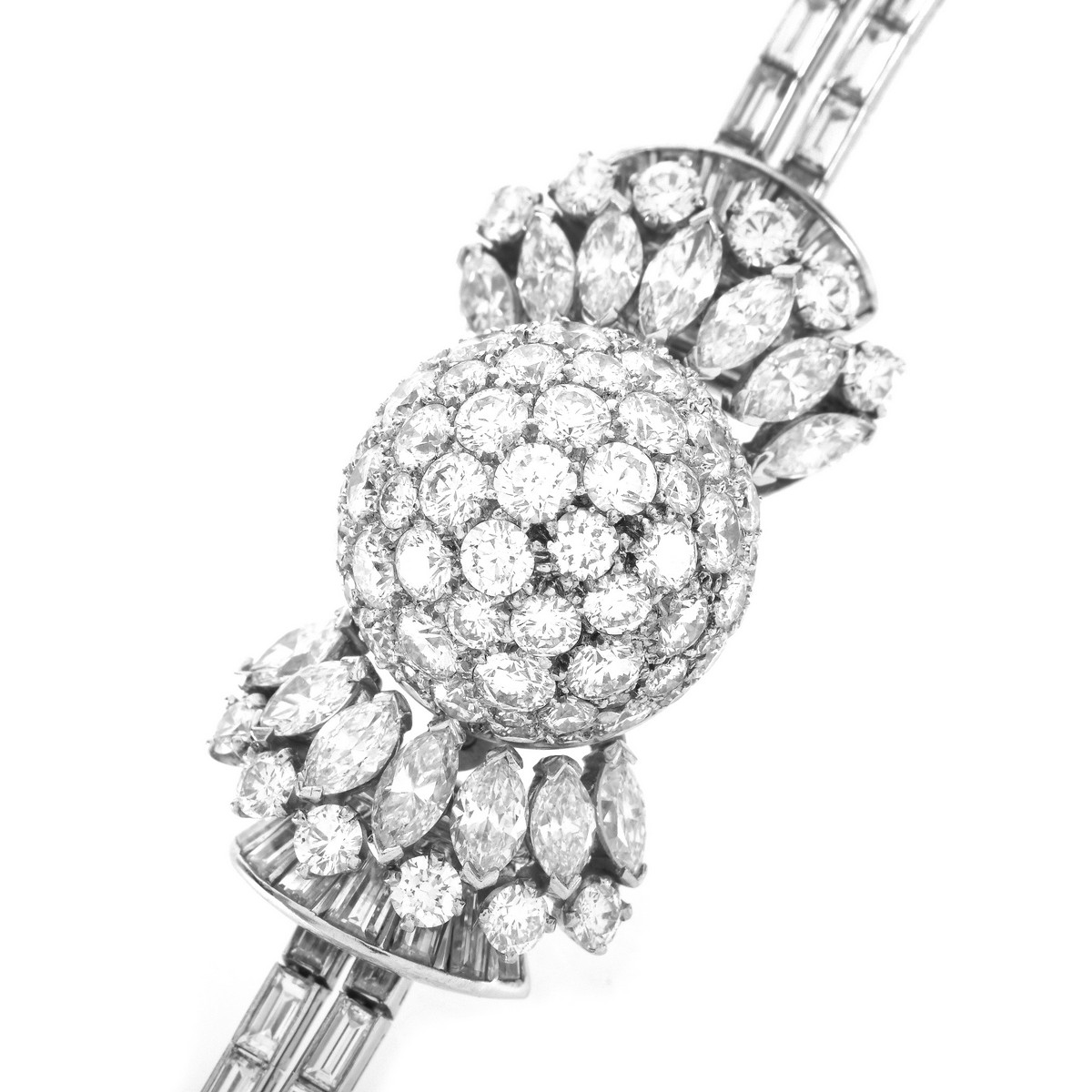 Vintage Van Cleef & Arpels Diamond and 18 Karat White Gold Dome Bracelet Watch with LeCoultre Manual Movement. Set throughout with round brilliant, marquise and baguette cut diamonds E-F color, VVS-VS clarity. Stamped Van Cleef & Arpels, numbered NY16233. Case measures 17mm; bracelet 6-1/8" L. Approx. weight: 46.1 grams. Condition: Very good vintage condition. Running. Please note the gallery does not warranty the running condition of watches. Estimate: $12000.00 - $15000.00 Domestic Shipping: $32.00