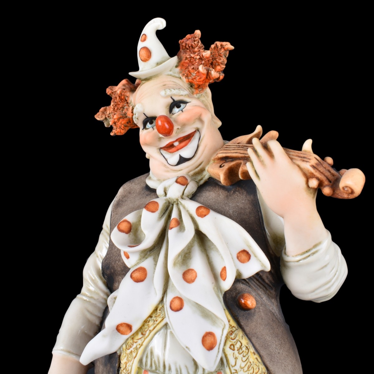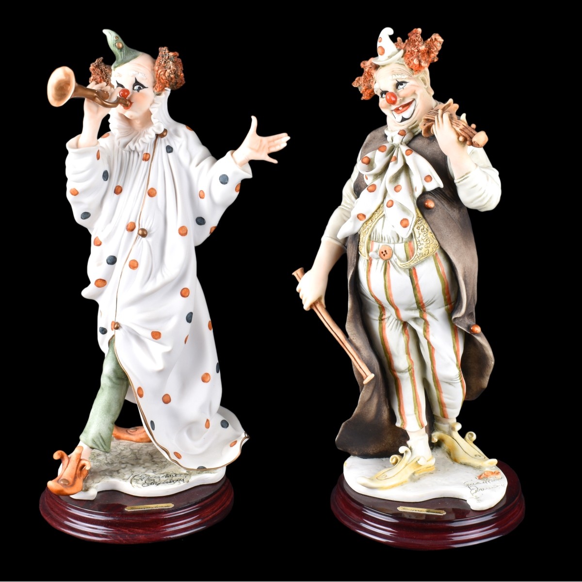 Two (2) Giuseppe Armani Polychrome Porcelain Clown Figurines Mounted on Wooden Base. Each is double signed, tag mounted to base. Each measures 13-3/8" H Condition: Good condition Estimate: $50.00 - $150.00 Domestic Shipping: $95.00