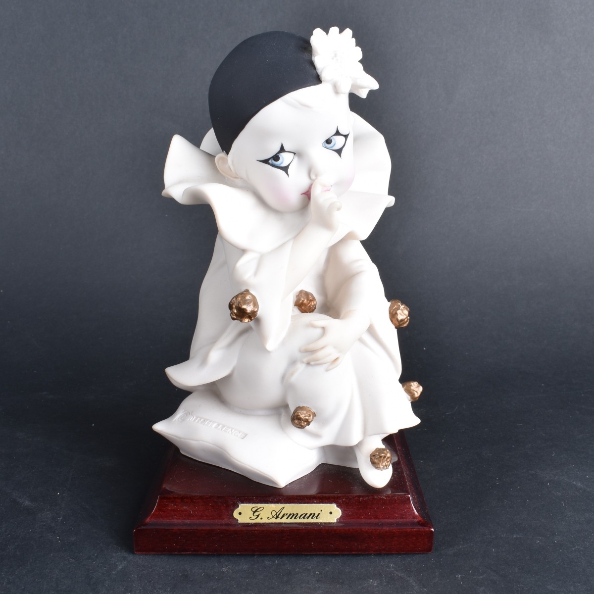 Four (4) Giuseppe Armani Florence Porcelain Young Clown Figurines Mounted on Wooden Base. Each signed to surface, tag attached to base. Tallest measures 7-3/4" H, smallest measures 5-3/4" H. Condition: Good condition Estimate: $50.00 - $150.00 Domestic Shipping: $68.00