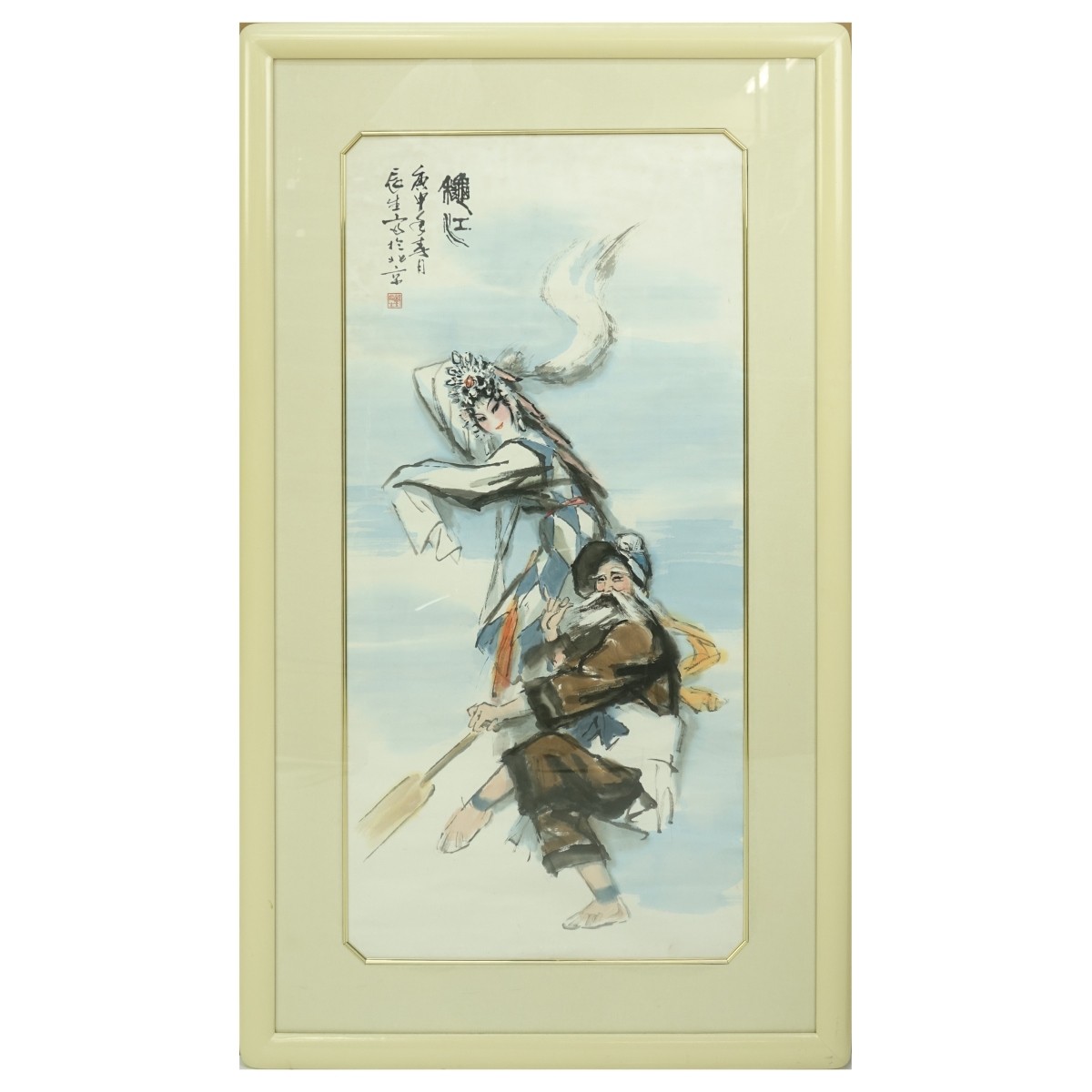 Modern Chinese Watercolor On Paper "Dancers". Signed upper left. Measures 36" x 17-1/2" (sight), frame measures 45-1/2" x 27". Condition: Good condition. Estimate: $50.00 - $100.00 Domestic Shipping: Third party
