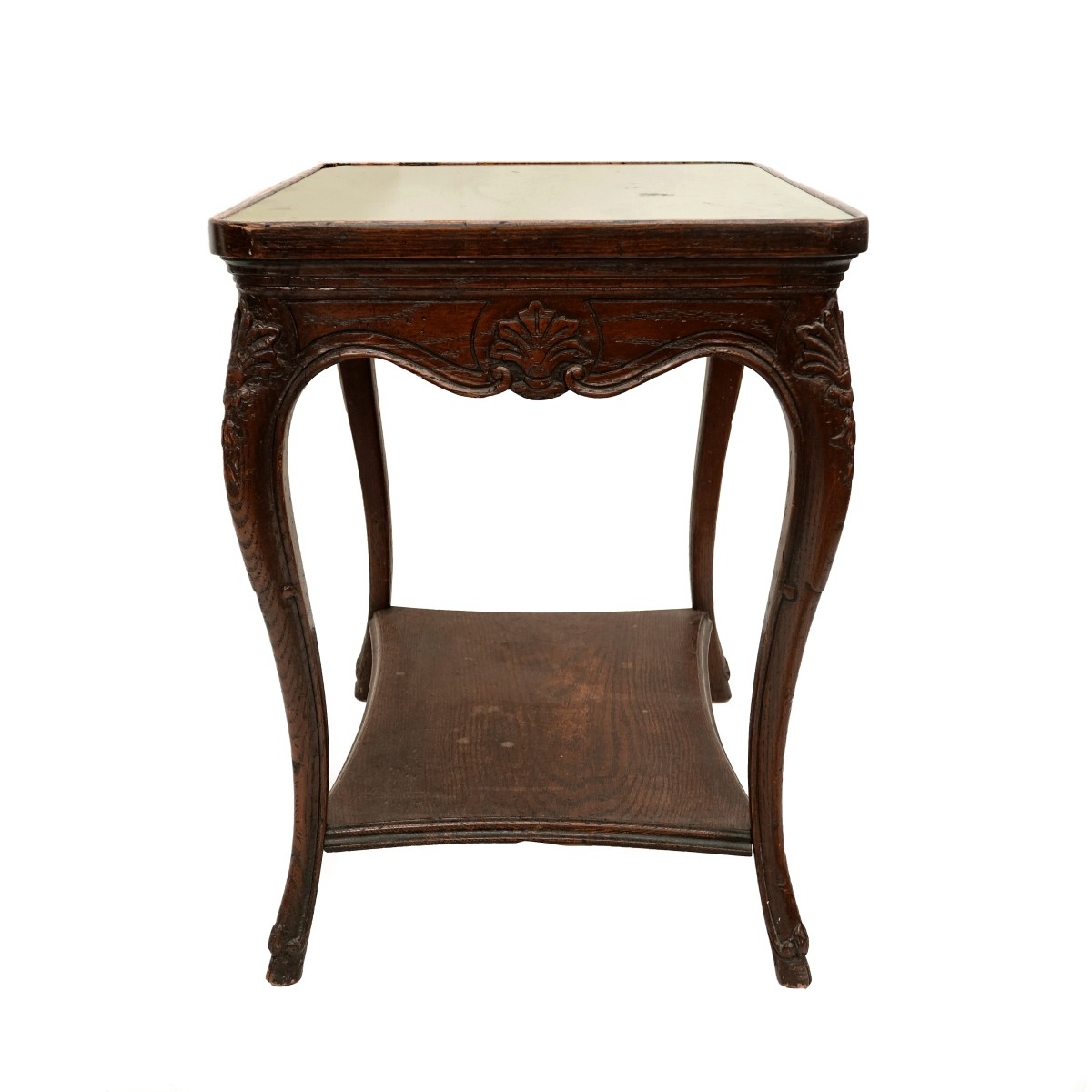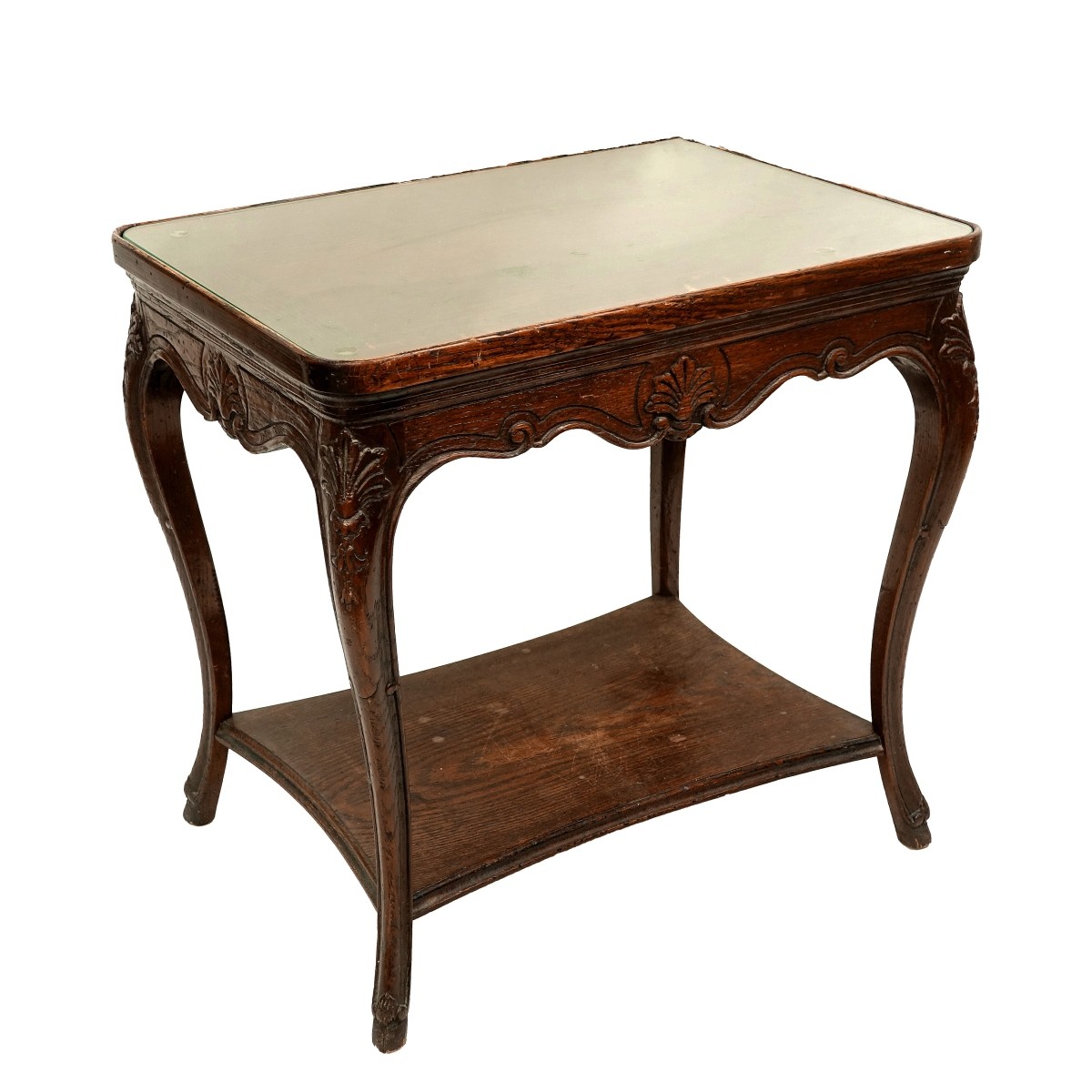 Vintage French Louis XV Style Carved Oak Occasional Table with Drawer, later added glass top. Measures 27" H x 27-1/4" W x 20-1/2" D. Condition: Wear to top, scratches, rubbing, water spots to surface. Estimate: $25.00 - $50.00 Domestic Shipping: Third party