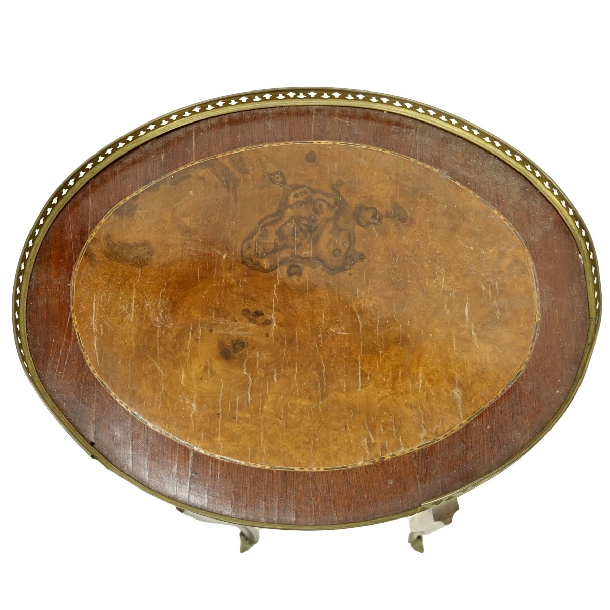 Louis XVI Style French Burlwood Inlaid Side Table with Gallery Top. Three drawers with brass mounts and cabriole legs. Measures 28-3/4" H x 16-1/4" W. Condition: Wear to top, scratches, wear to veneer Estimate: $50.00 - $100.00 Domestic Shipping: Third party