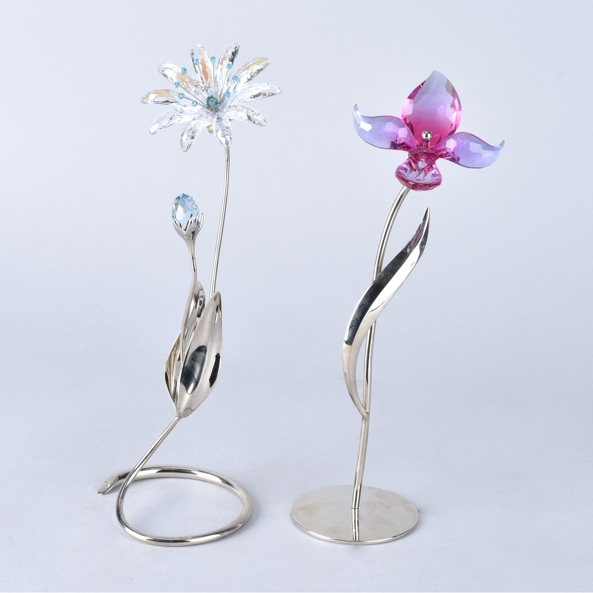 Two (2) Swarovski crystal flowers on chrome stem bases. Signed. Tallest measures 9" H. Condition: Good condition. Estimate: $50.00 - $100.00 Domestic Shipping: $38.00