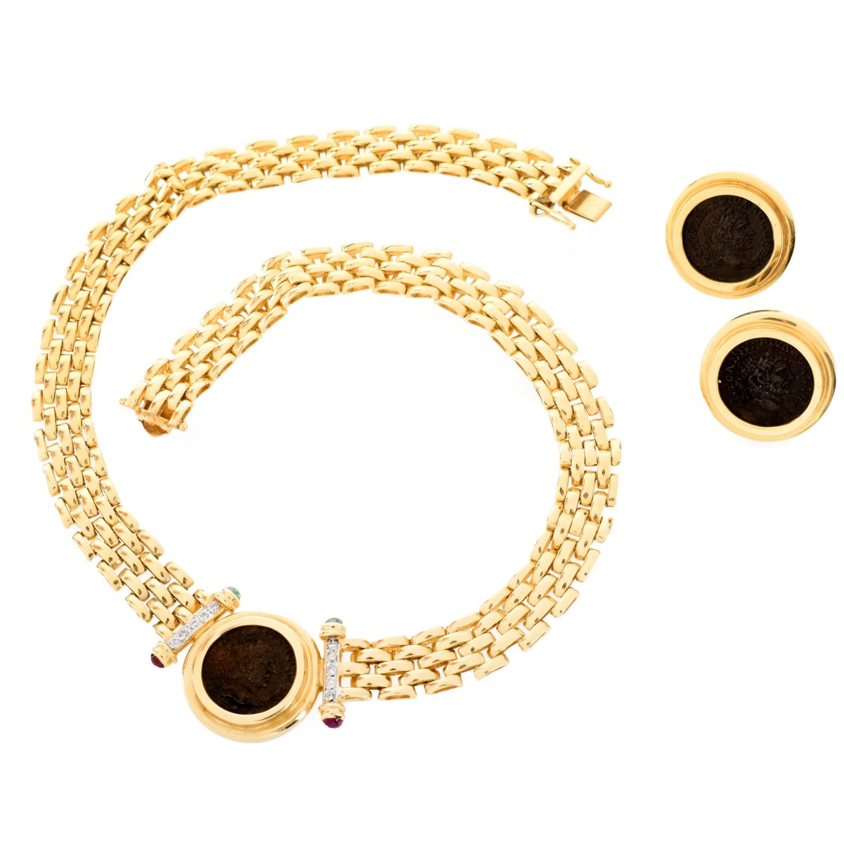 Vintage 14 Karat Yellow Gold and Roman Coin Pendant Necklace with Small Diamond, Emerald and Ruby accents together with matching Earrings. Stamped 14K. Necklace measures 16-1/4" L, 1" W; earrings measure 1" diam. Approx. weight: 68.2 grams. Condition: Very good vintage condition. Estimate: $1000.00 - $1500.00 Domestic Shipping: $32.00
