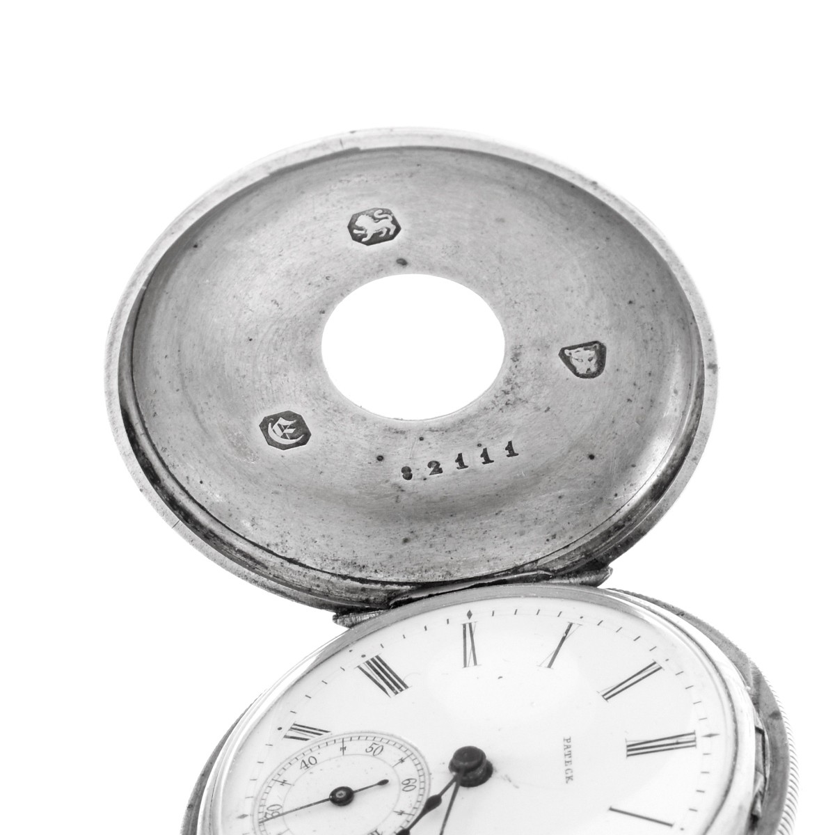 Antique Circa 1840 English Sterling Silver Pocket Watch with Key Wound Swiss Pateck Movement, Blue Enamel Roman Numerals to Case Front. Dial and movement signed Pateck, case with London hallmarks, date mark. Case measures 40mm. Approx. weight: 57.8 grams. Condition: Good antique condition. Typical wear and minor dings to case consistent with age and normal use. Running. Please note the gallery does not warranty the running condition of watches. Estimate: $200.00 - $400.00 Domestic Shipping: $30.00