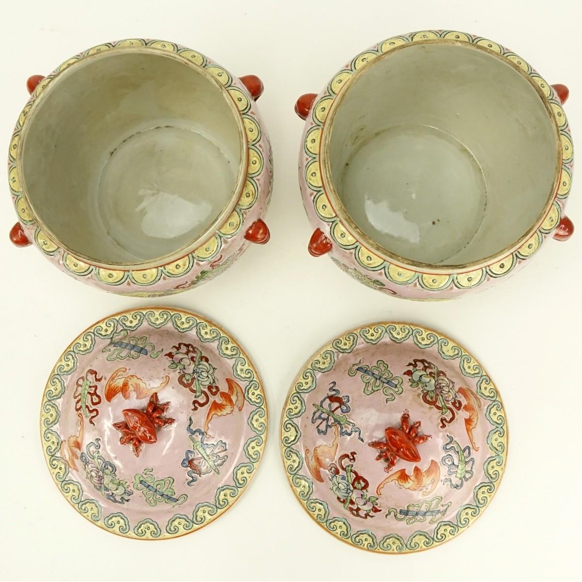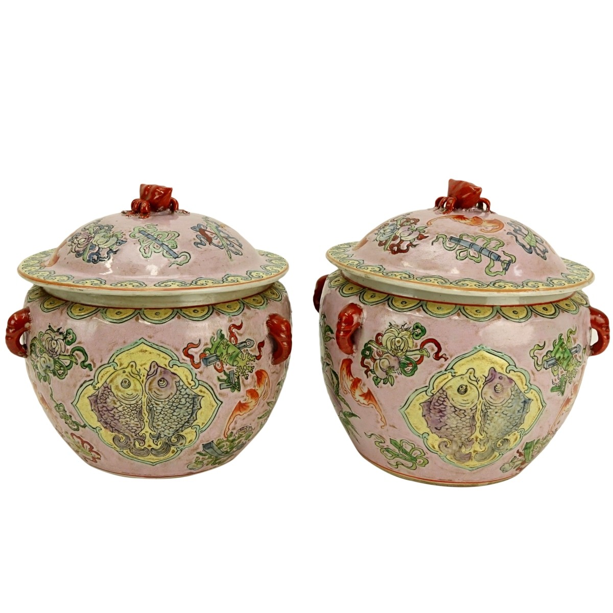 Pair of 20th Century Chinese Pink Ground Porcelain Covered Jars with Peach, Koi Fish and Bat Decoration. Unsigned. Measure 7" H, 7" W. Condition: Very good condition. Estimate: $50.00 - $100.00 Domestic Shipping: $85.00