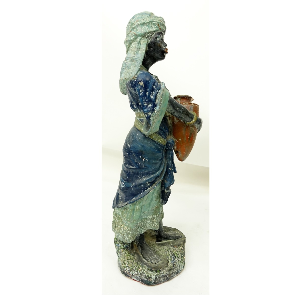 Large Vintage Polychrome Pottery Nubian Female with Jug Figure. Measures 28-1/2" H. Condition: Rubbing, chips and nicks Estimate: $50.00 - $100.00 Domestic Shipping: Third party