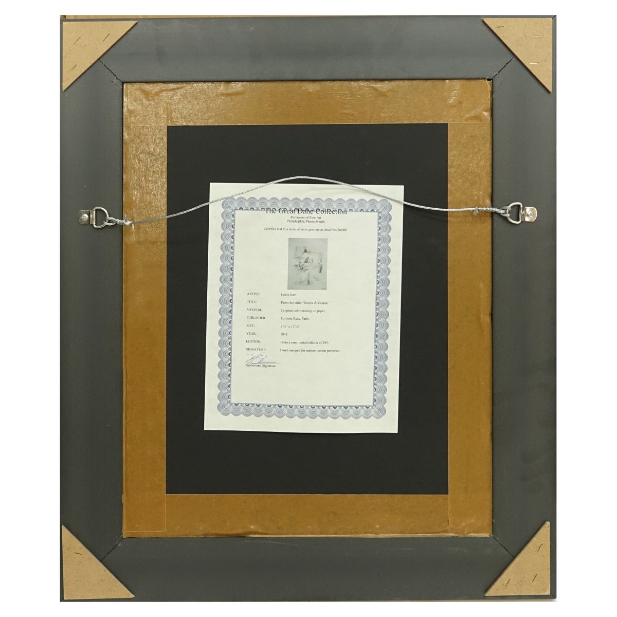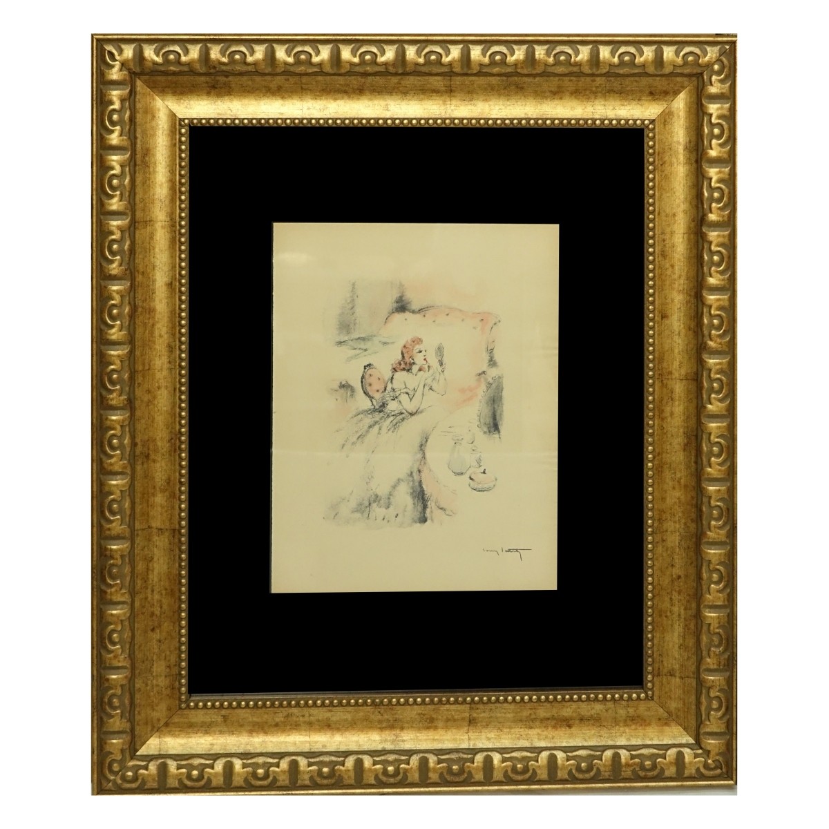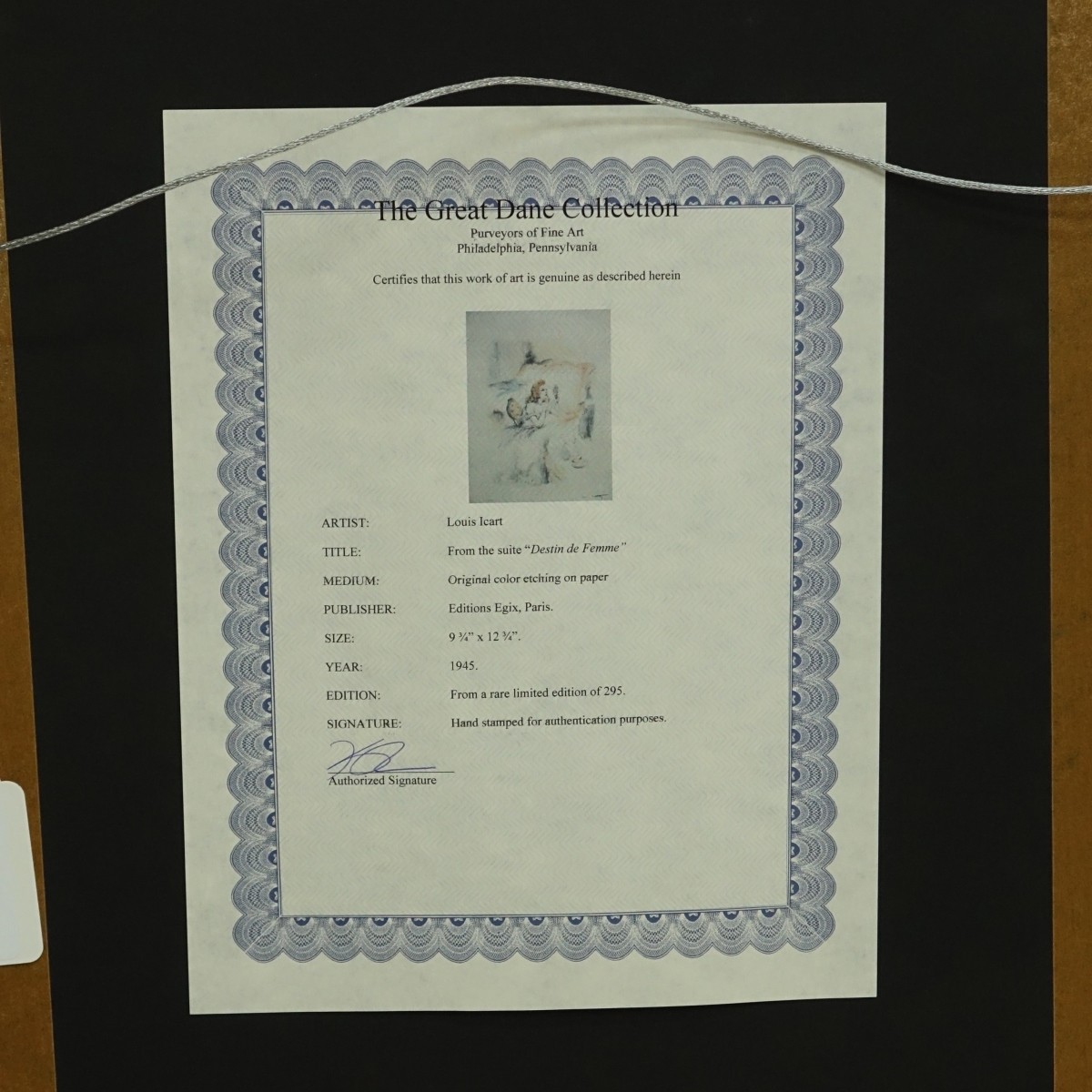 Louis Icart, French (1888 - 1950) Color Etching "Destin de Femme" Signed Lower Right. The Great Dane Collection COA attached en verso. Measures 13" H x 9-3/8" W, fe measures 26" H x 22" W. Condition: Some toning, light spotting otherwise good condition Estimate: $150.00 - $250.00 Domestic Shipping: Third party