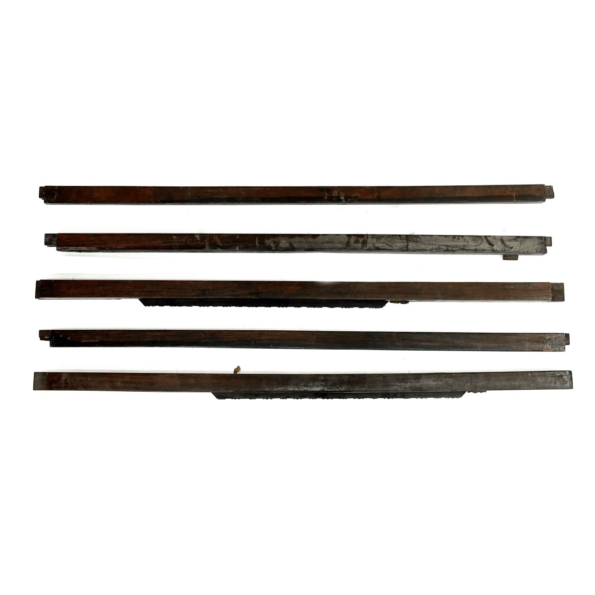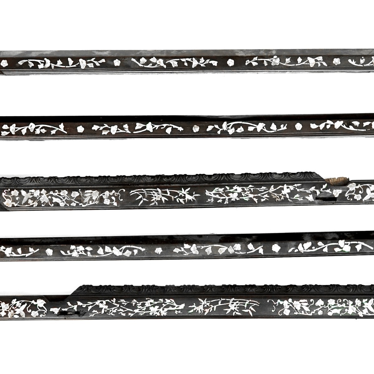 Grouping of Five (5) Antique Chinese Hardwood Carved Mother of Pearl inlaid Fragments. Largest fagment measures 47-1/2" x 2" x 2-1/4", smallest measures 46" x 1-1/2" Condition: Wear, rubbing, losses from previous condition Estimate: $50.00 - $150.00 Domestic Shipping: Third party