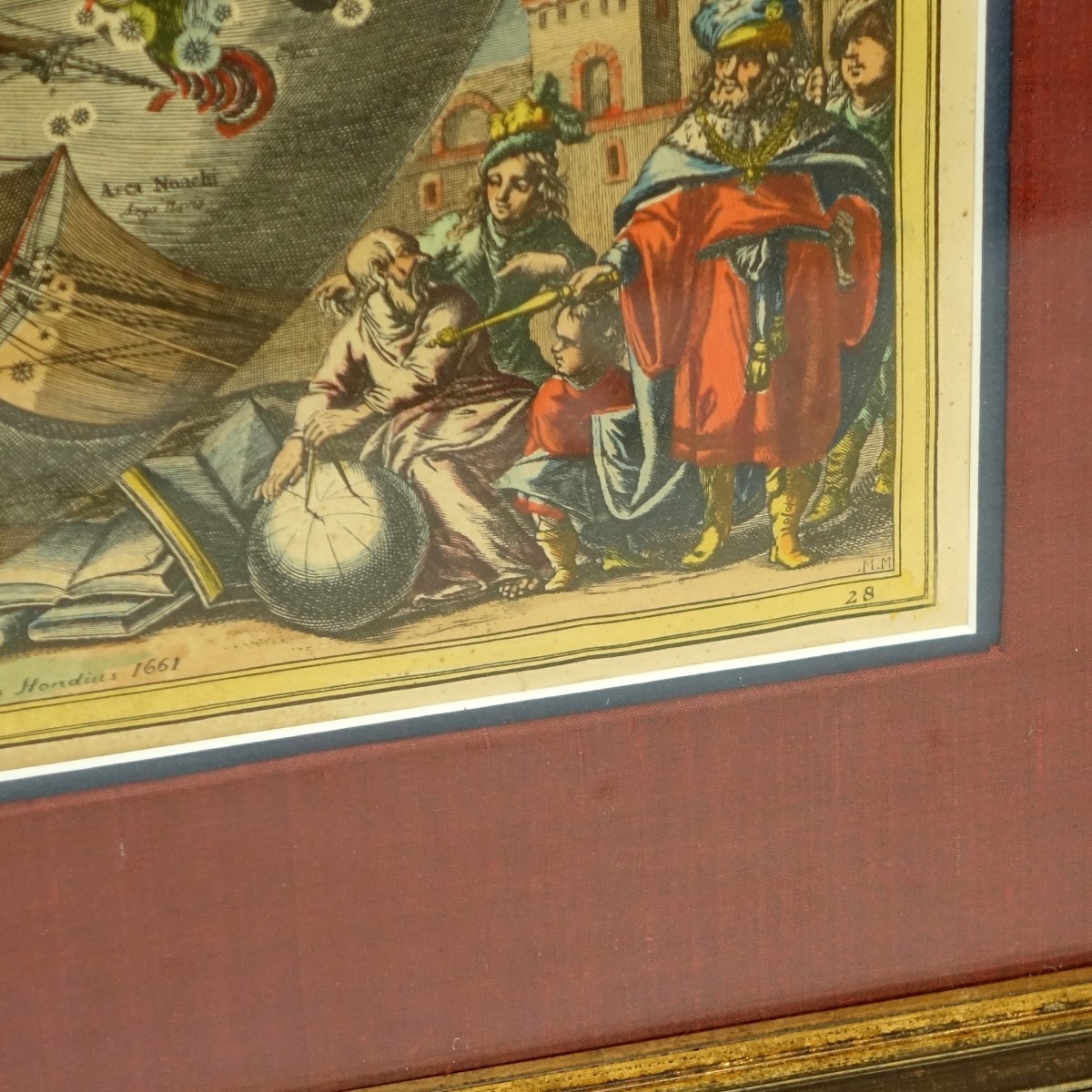 17th Century Dutch Hand-Colored Copper Engraving. Hemisphaeri Graphicum Coeli Tiet, VM Sceno Australe Stella Terra. Signed and Dated in Plate "Henricus Hondius 1661" (Dutch, 1615-1676). Sight measures 17" H x 19-1/2" W, frame measures 26-1/4" H x 28-3/4" W. Condition: Foxing and toning Estimate: $100.00 - $200.00 Domestic Shipping: Third party