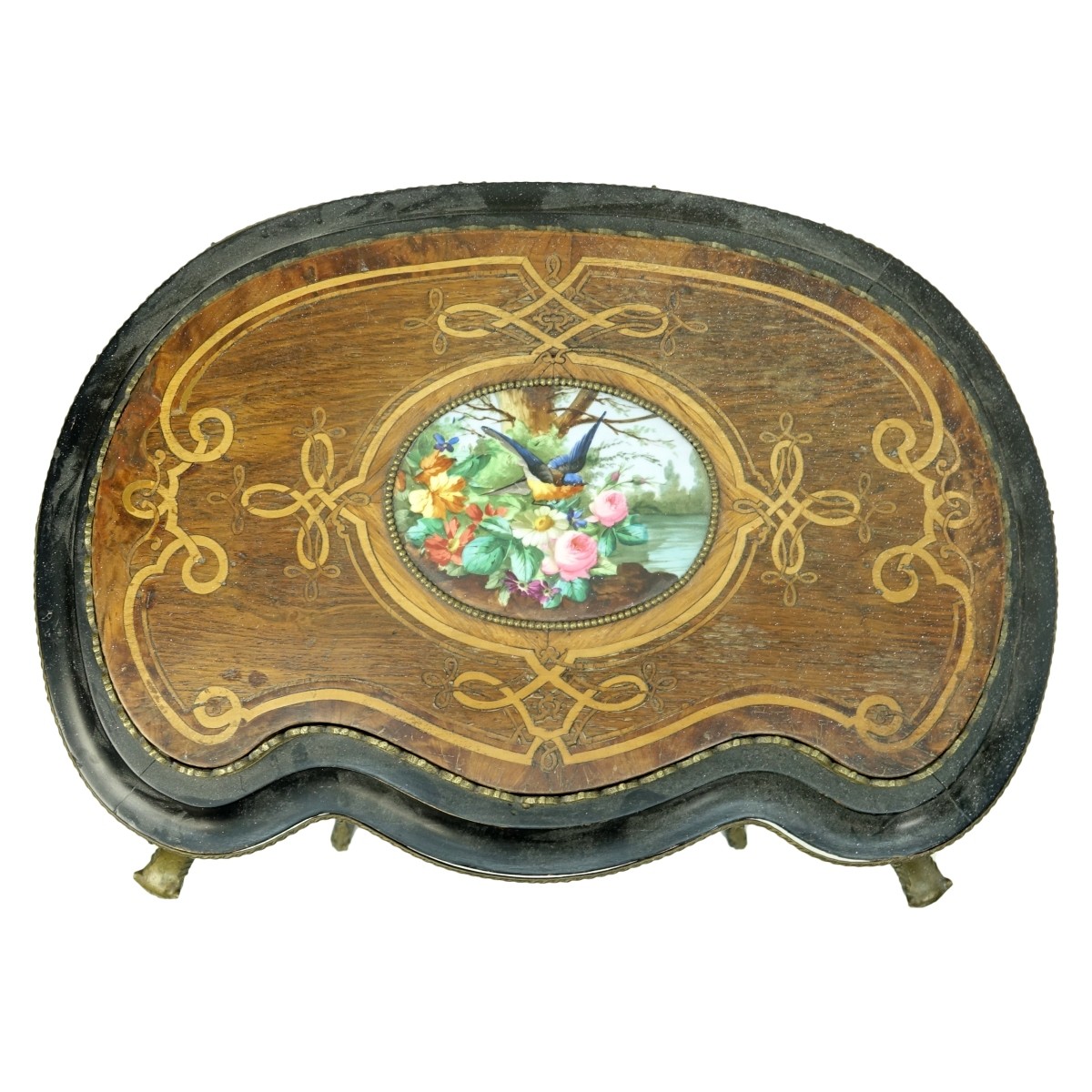 Antique Bronze Mounted Inlaid Kidney Shaped Table With Inset Hand Painted Plaque. Unsigned. Measures 32" H x 20" L x 14" D. Condition: Wear and rubbing. Estimate: $100.00 - $200.00 Domestic Shipping: Third party