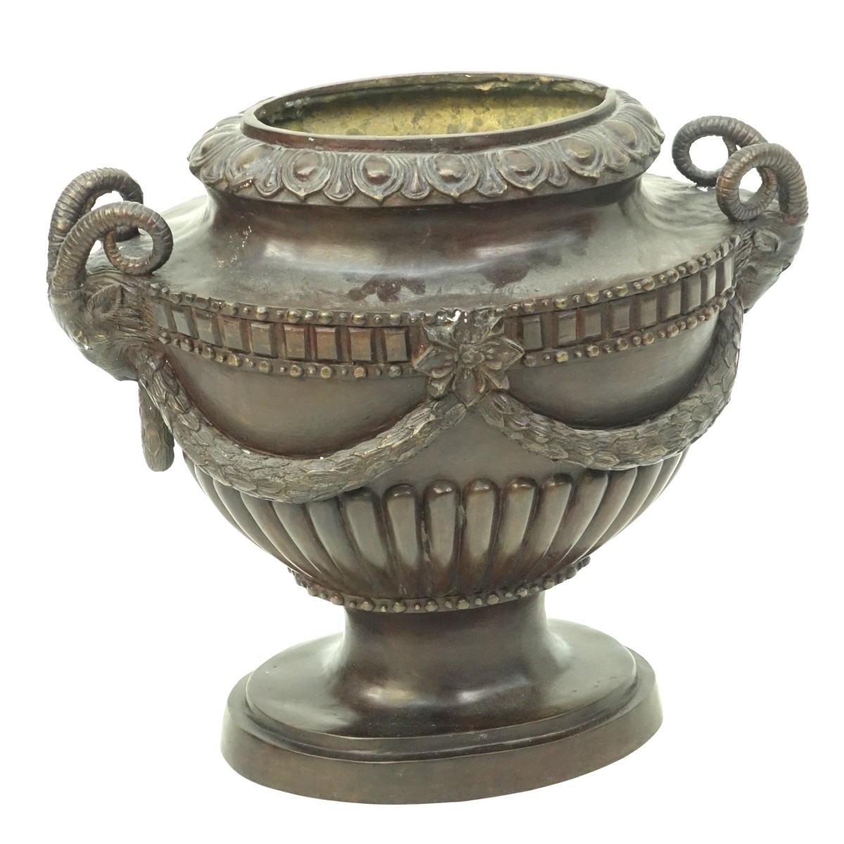 Modern Empire Style Bronze Centerpiece with Ram Headed Handles. Acanthus leaf. and floral accent on fluted surface. Measures 15" H x 17" W. Condition: Rubbing Estimate: $150.00 - $250.00 Domestic Shipping: Third party