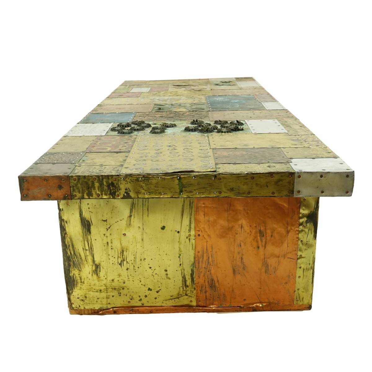 Paul Evans Style Mid Century Riveted Metal Patchwork Coffee Table. Decorated with mixed metals and motifs. Unsigned. Measures 14" H x 56" L x 20" D. Condition: Some wear and losses. Estimate: $1200.00 - $1800.00 Domestic Shipping: Third party