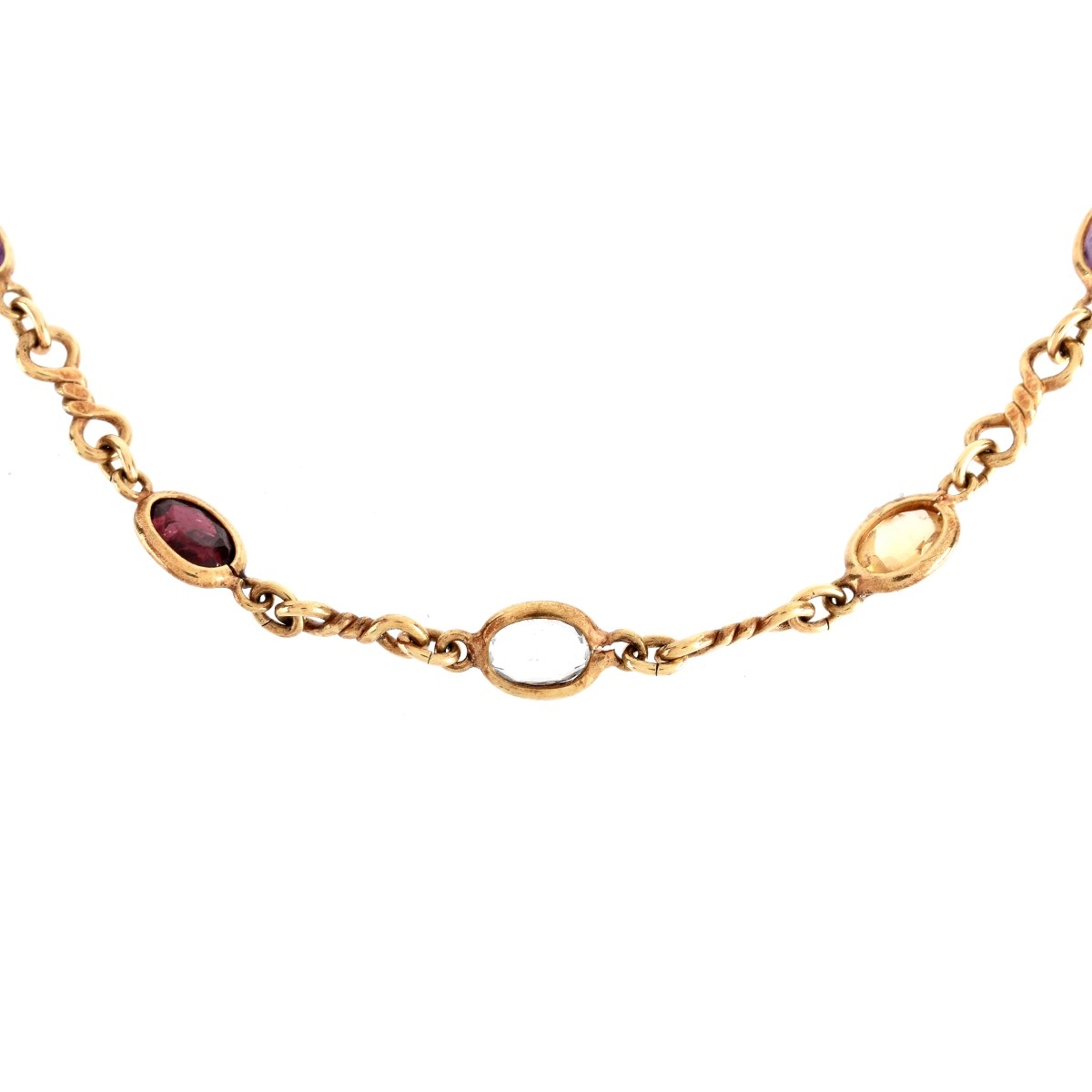 Vintage Oritalia Oval Cut Multi Gemstone and 14 Karat Yellow Gold Necklace. Signed , stamped 14K. Measures 14-1/2" L. Approx. weight: 13.2 grams. Condition: Good vintage condition. Estimate: $300.00 - $400.00 Domestic Shipping: $30.00